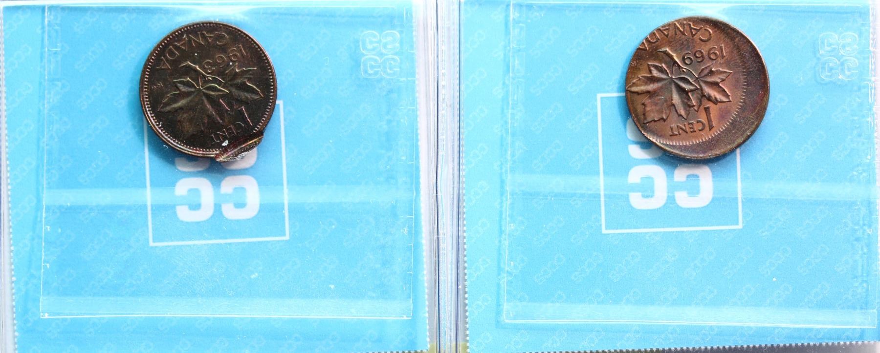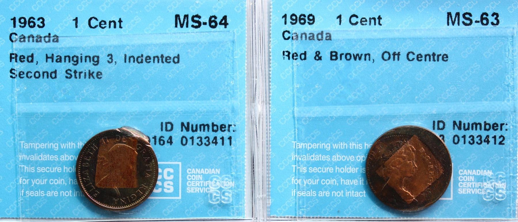 Error/Variety; 1963 1¢ Hanging 3, Indented Second Strike Choice Mint State-64RD & 1969 Off Centre Strike Choice Mint State-63RB. Lot of 2 CCCS graded coins.