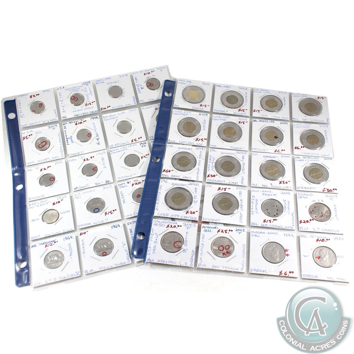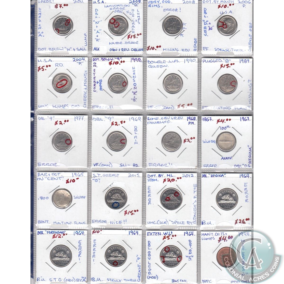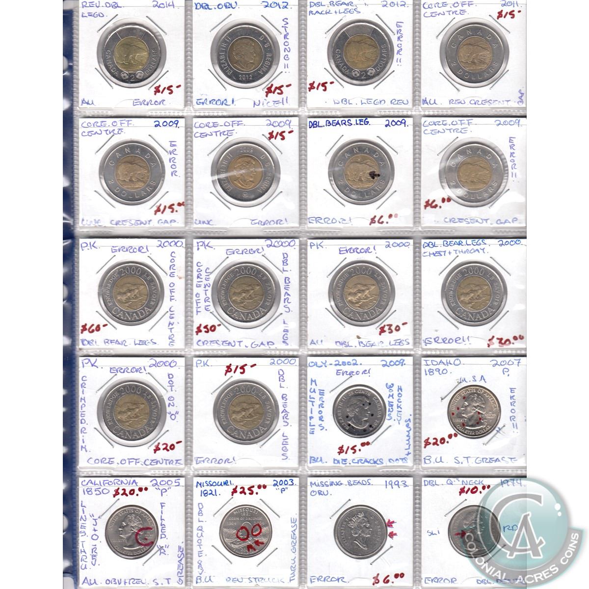 Error coins; Canada 1-cent, 5-cent, 10-cent, 25-cent, $2 & 6x USA 10-cents & 25-cents Errors and Varieties. 40pcs