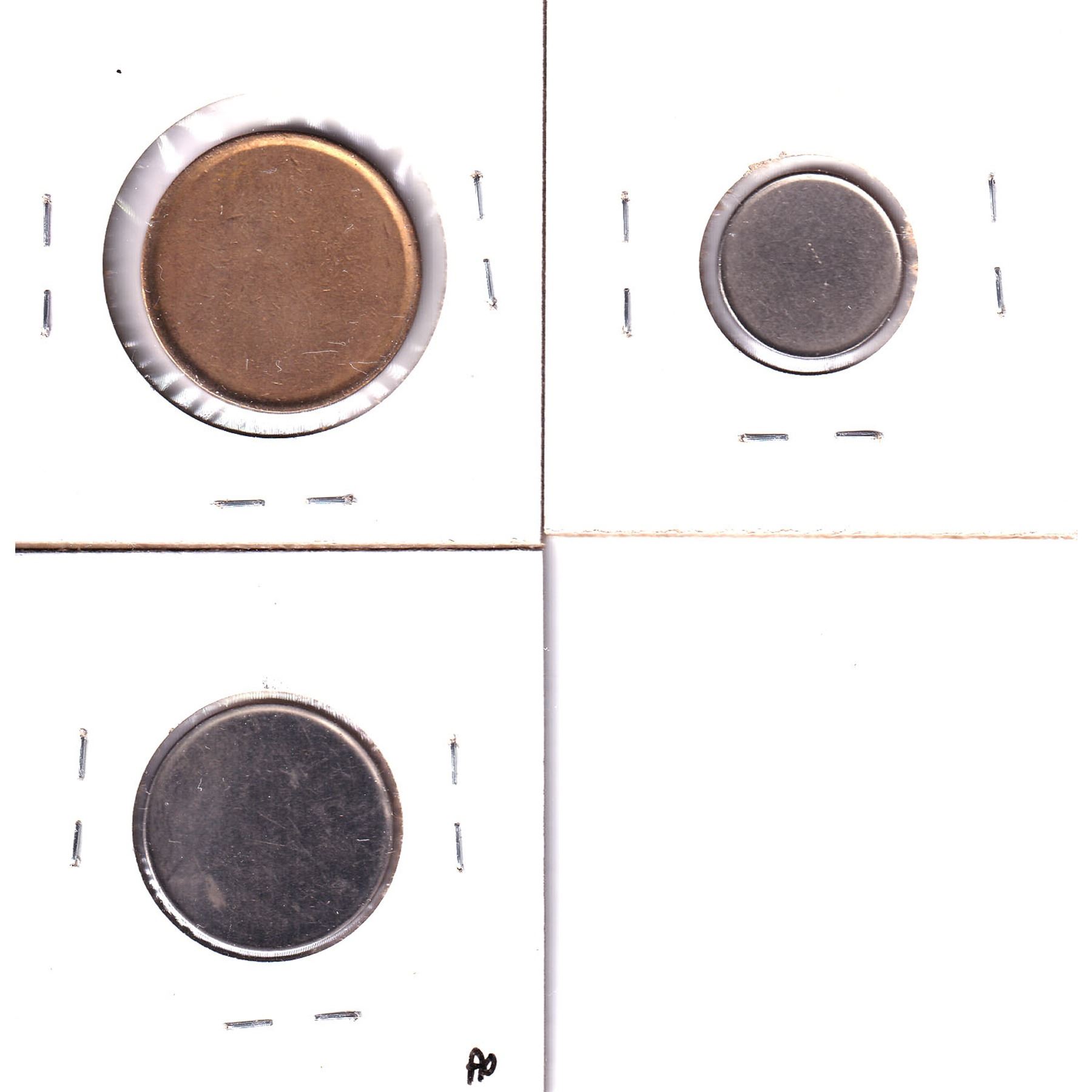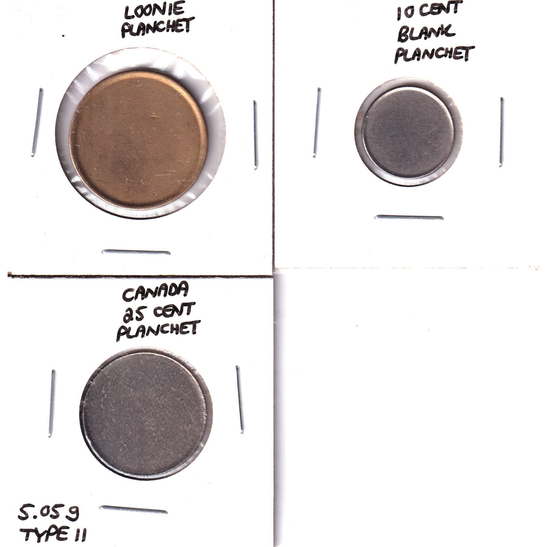 Error lot of 3x Canadian Blank Planchets. Lot includes: 10-cent Magnetic, 25-cent 5.05g Type II Magnetic, & Loon (3pcs)