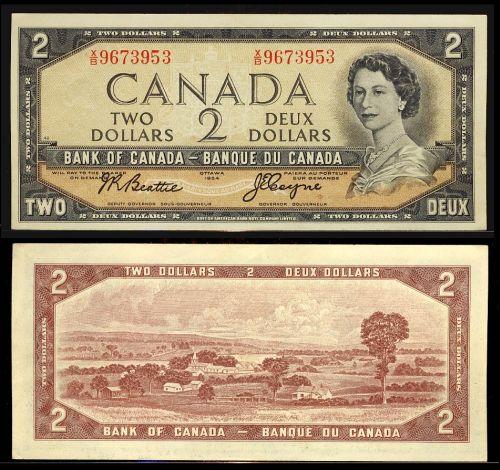 Error note. 1954 $2 Beattie-Coyne BC-38a X/B9673953 AU. The colour on the face is very similar to the 1954 $50 note while the back shows normal colour.