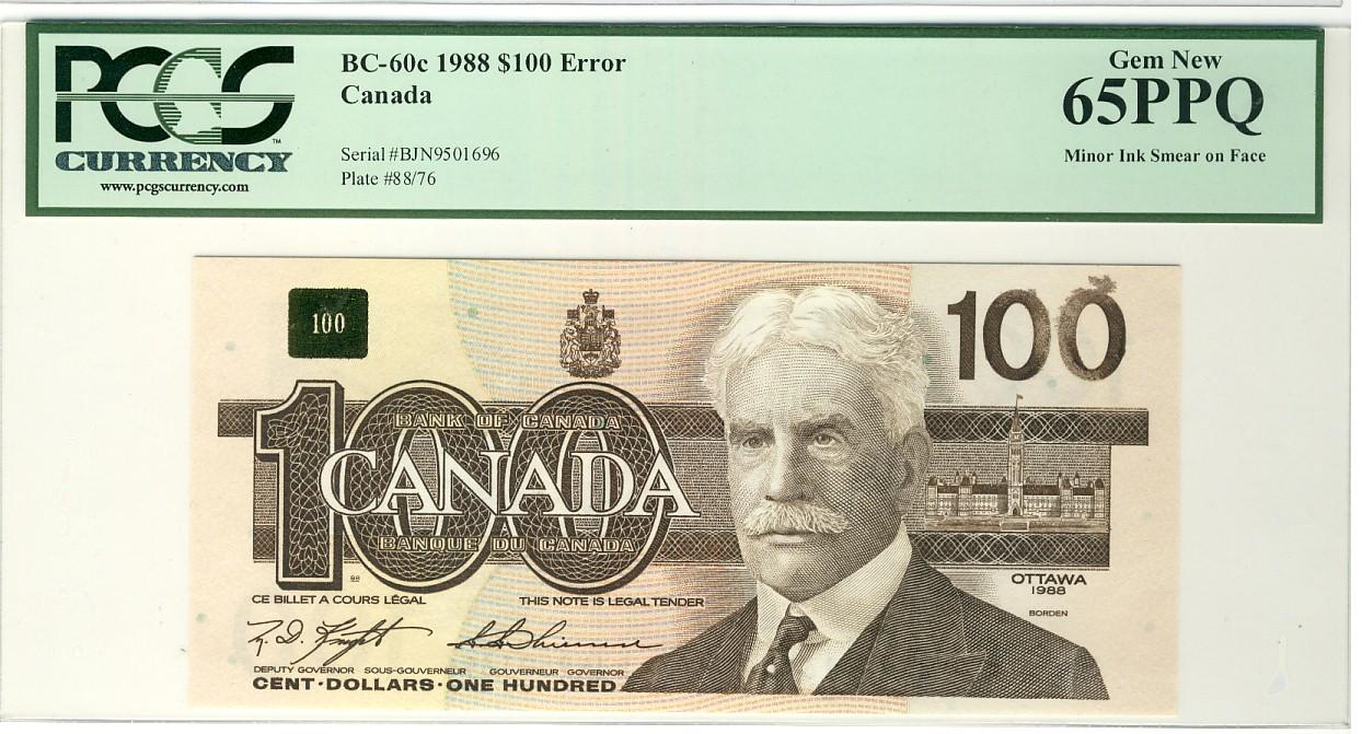 Error note, 1988 $100 BC-60c #BJN9501696, PCGS Gem UNC65PPQ. The denomination 100 is smeared from print. Interesting Error note, . Should be viewed.