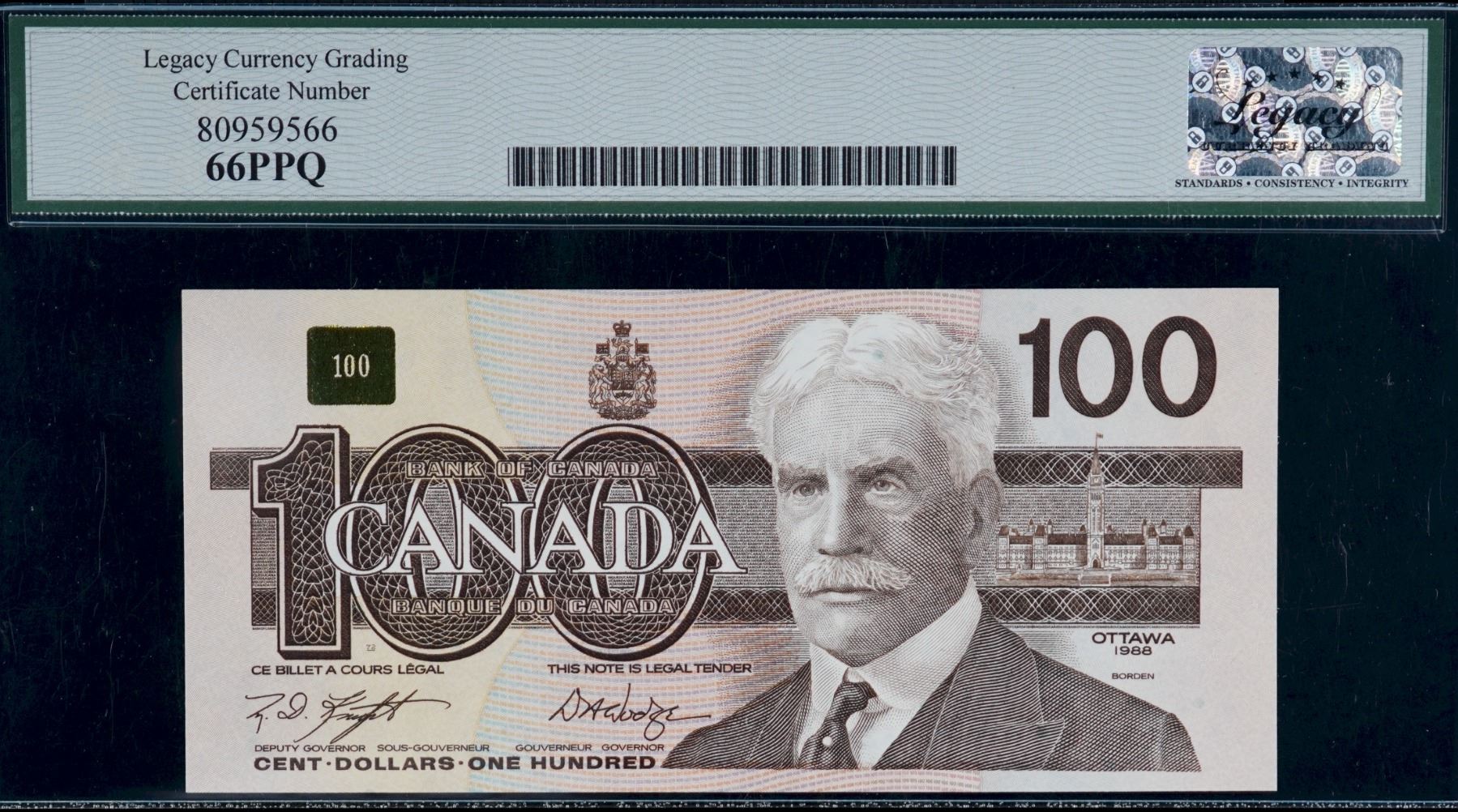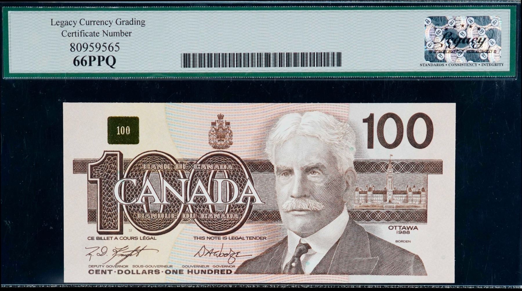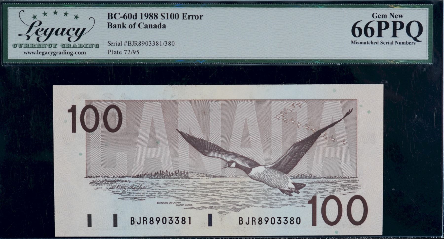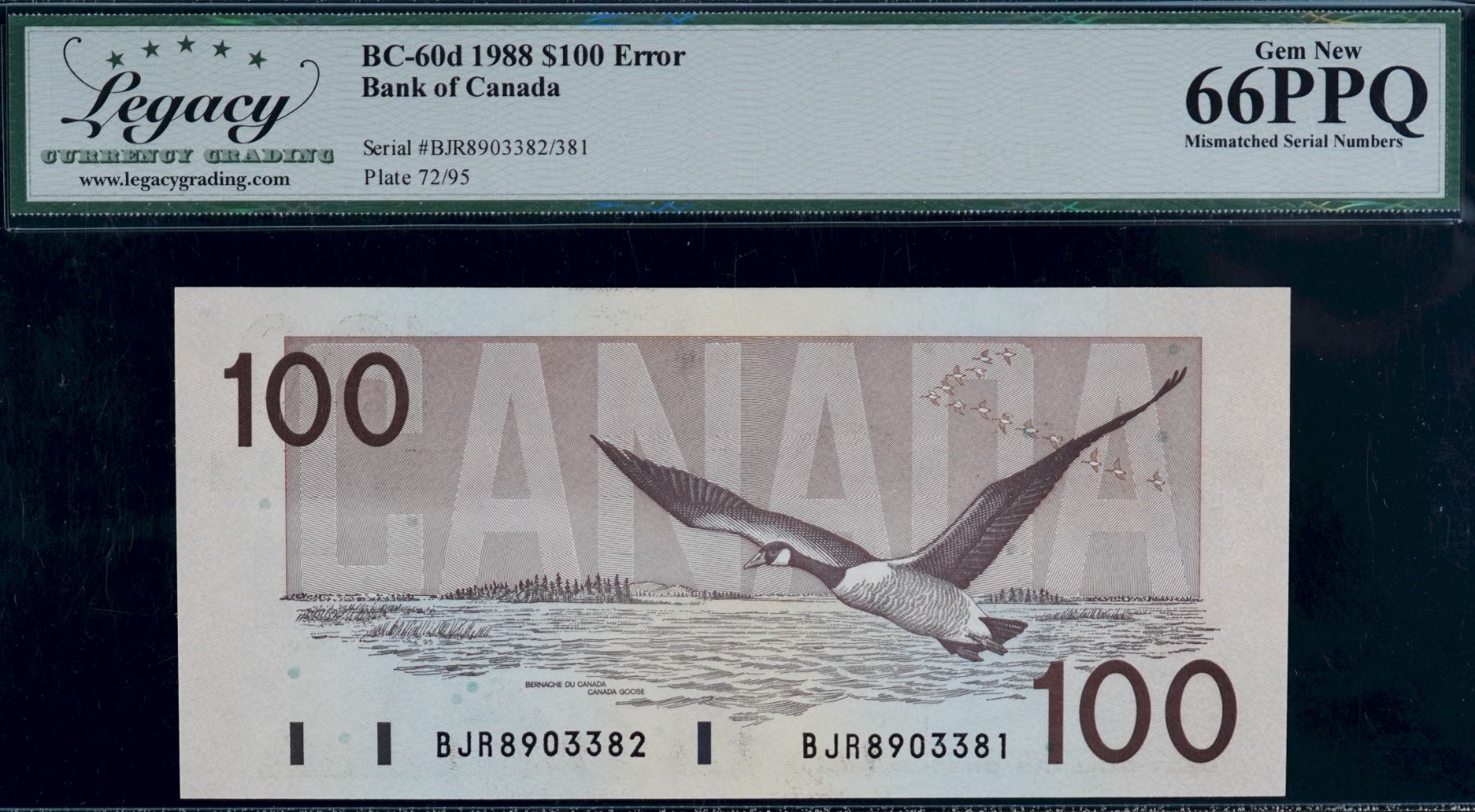 Errors; Pair of "Mismatched serial Numbers" 1988 $100 BC-60d #BJR8903381/ #BJR8903380 & 1988 $100 BC-60d #BJR8903382/ #BJR8903381 both LCG Superb Gem Uncirculated-66PPQ. Both notes bear the same serial number BJR8903381 but on different side, and a different number on the other side. Pretty cool! A must see!