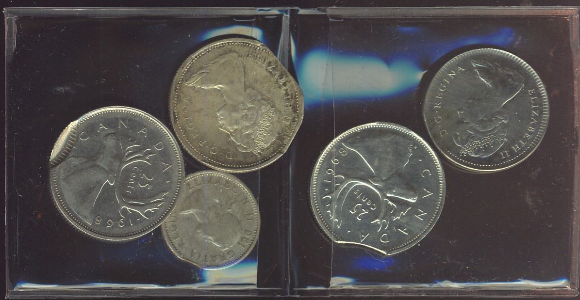 Errors/Varieties Lot; includes 1973 5¢ Broad struck; 1965 10¢ Small Round Clip at 2:00 o’clock; 1968 25¢ Nickel. Round Clip at 1:00 o’clock; 1965. Straight Clip at 9:00 o’clock and tiny clip at 3:00. 1968, Nickel. Partial Brockage at 5:00 o’clock. Lot of five (5) errors.