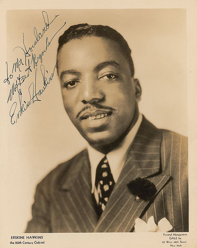 Vintage glossy 8 x 10 publicity photo of Hawkins in a pinstriped suit, signed and inscribed in fountain pen, "To Mr. Howland, my best regards, Erskine Hawkins." In fine condition, with light scattered creases.