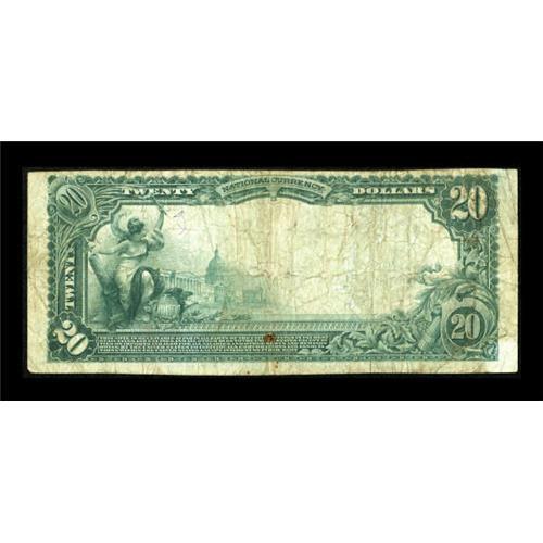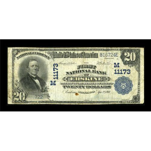 <B>Erskine, MN</B></I> - $20 1902 Plain Back Fr. 658 <B>The First NB</B></I> Ch. # (M)11173<BR> This large only bank was in business for not quite 11 years, from 1918 until 1929 and issued Plain Backs only. Until the discovery of this solid <B>Fine</B></I> example, the census stood at just three of the $5 and one of the $10 denomination. We anticipate spirited bidding for this item based on its rarity as a bank, a type and denomination within the issuing institution and its superior overall level of eye appeal for the grade. Attempting to predict when another $20 Plain Back might be available again would be pure speculation. Suffice it to say that the wait will certainly be considerable.<BR><BR><b>Shipping:</b> Coins & Currency (<a target="_blank" href="http://www.heritageauctions.com/common/shipping.php">view shipping information</a>)