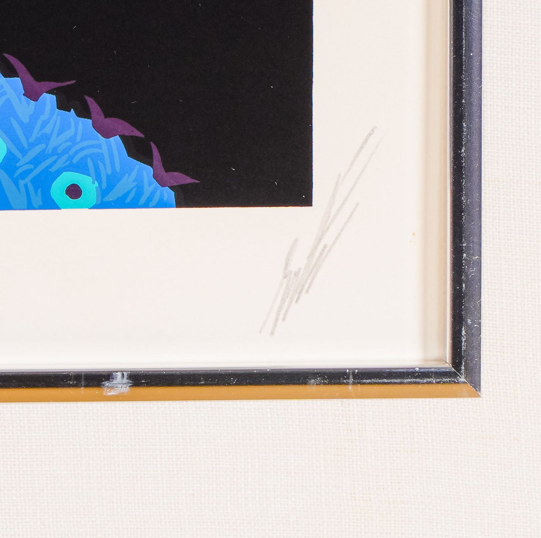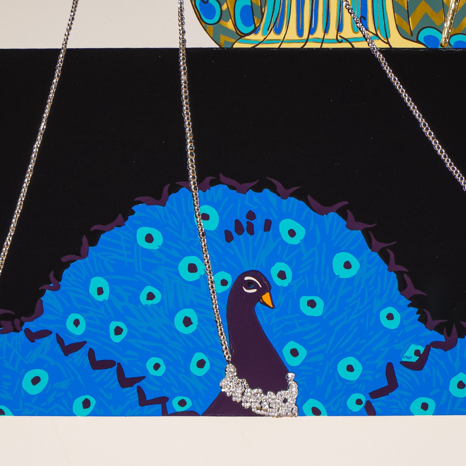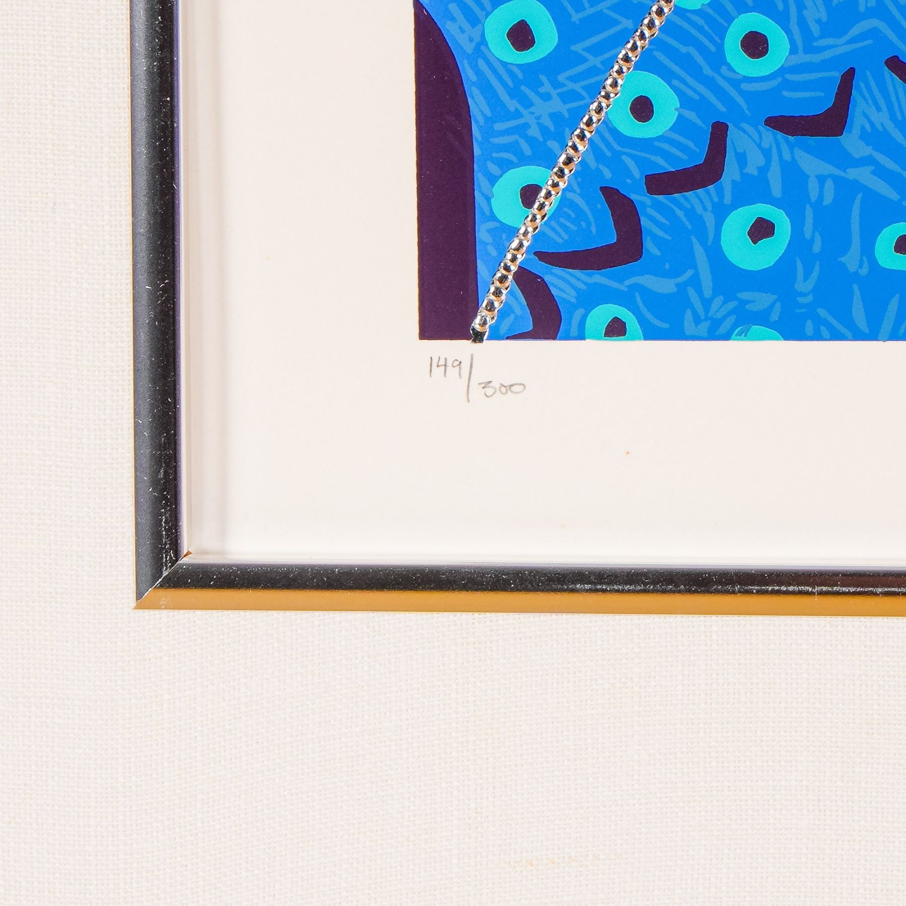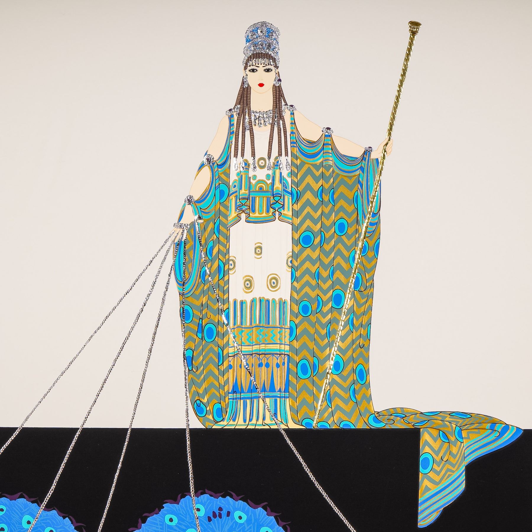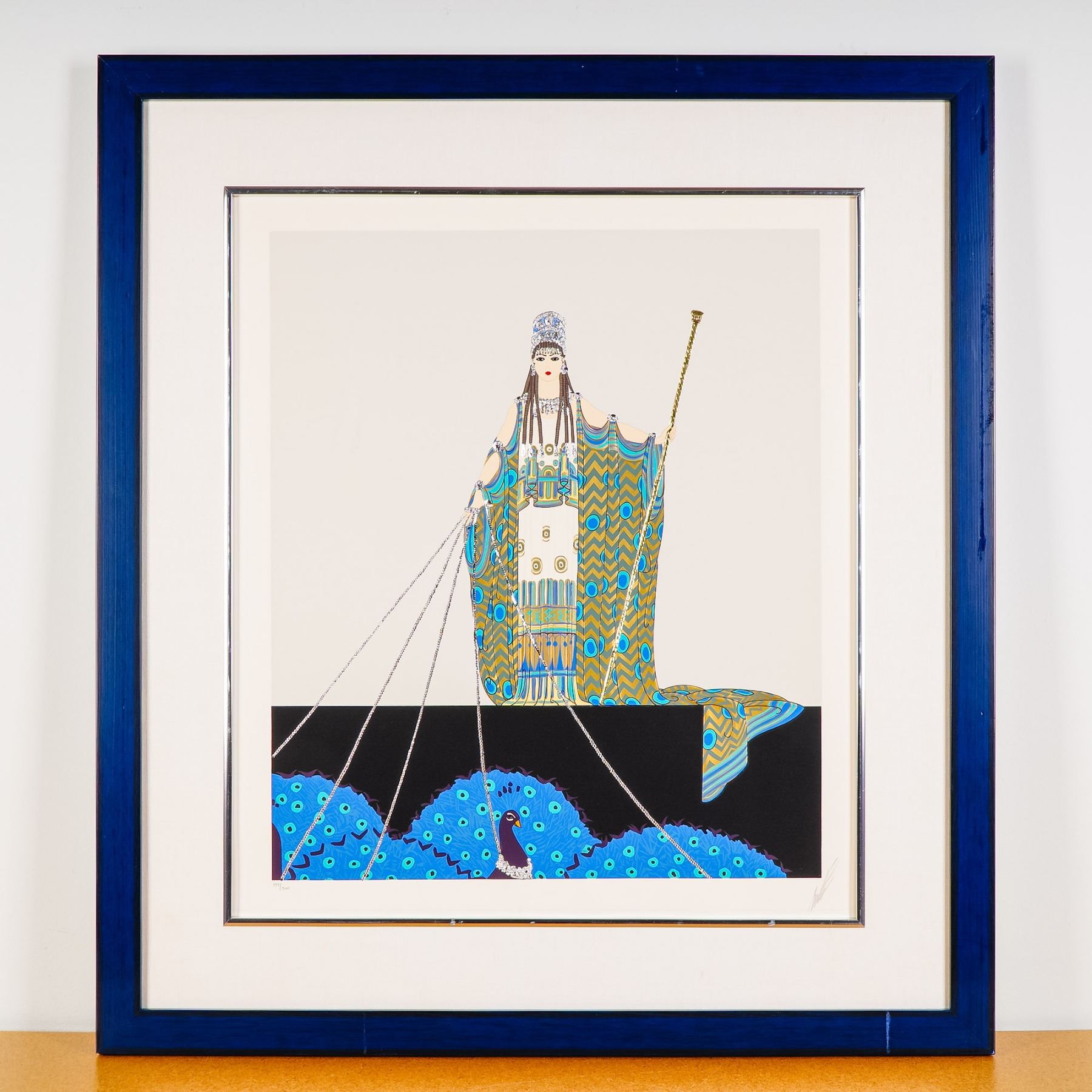 An extraordinary limited edition embossed serigraph by the legendary Erte (Romain de Tirtoff), titled Hera. This dazzling work depicts the goddess Hera in regal attire, adorned with intricate details and accompanied by majestic peacocks, a hallmark of her symbolism. The composition bursts with vivid blues, golds, and metallic embellishments, enhanced by jeweled accents and fine embossing that lend a radiant, dimensional quality. Erte, celebrated as the father of Art Deco, was a Russian-born French artist whose career spanned fashion design, theater, costume, and fine art. His striking style defined the glamour and elegance of the early 20th century, and his works remain iconic for their theatricality, stylization, and opulent detail. Framed in a striking blue and silver frame, this piece embodies Erte's unique vision and exquisite craftsmanship. A must-have for collectors of Art Deco masterworks and limited edition prints. Numbered 149/300 and hand-signed by the artist on lower right.