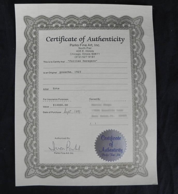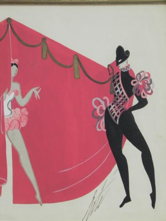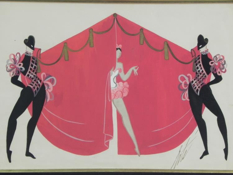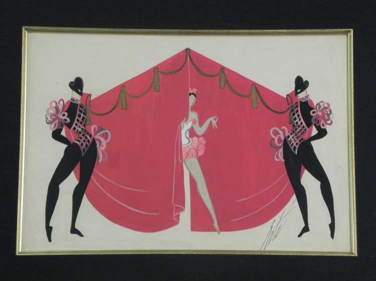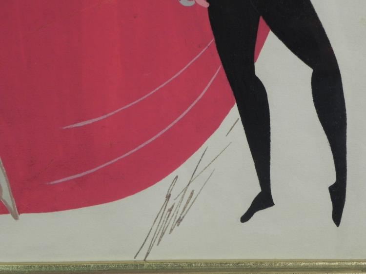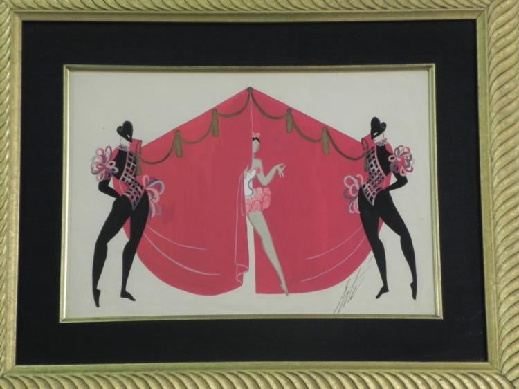 This early Erte gouache,1923, is unusual in that there are three ballet figures. This is unusual for two reasons, one of which is that two of the dancers are males, when most of Erte's subjects are females, and the other is that he mainly works with one figure per Gouache, making this one very rare. It was probably done for a ballet theater scene. It is entitled "Folies Bergere", an original which measures 14.5" by 10" with a nice gold frame. It is unique and comes from a local estate. It comes with a Certificate of Authenticity and is guaranteed to be original and unique. --- Original Gouache - Title: Folies Bergere - Year: 1923 - Signed: Erte, Bottom right - Image size: 14.5" x 10" - Image size with mat: 18"x14" - Frame size: 22.5" x 18" - Condition: Excellent - Certificate of Authenticity --- The astonishingly creative, prolific and long-lived artist known to the world as Erté (Russia, 1892- 1990), literally defined chic in the last century. A brilliant fashion illustrator turned dynamic theatrical designer turned wildly successful graphic artist turned critically acclaimed sculptor, Erté's work is flamboyant, sensual, witty, fantastic and highly collectible. --- An excellent addition to any collection!