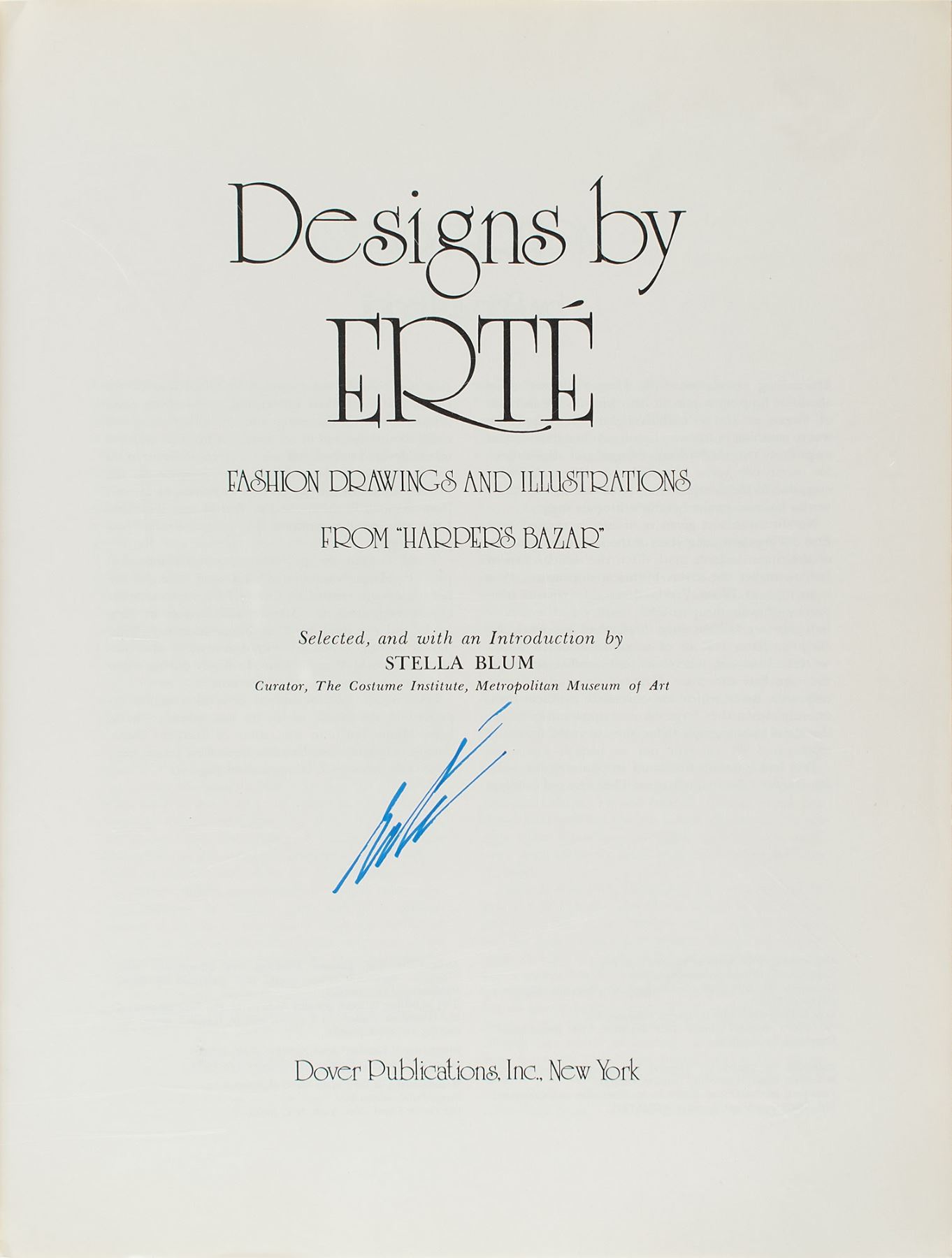 Signed book: Designs by Erte. First edition. NY: Dover Publications, 1976. Softcover, 9.25 x 12.25, 129 pages. Signed on the title page in blue felt tip, "Erte." In fine condition.