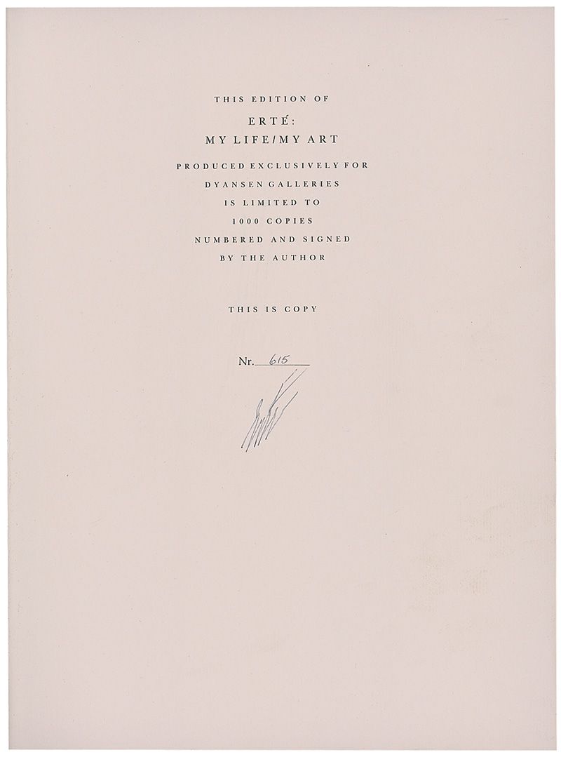 Signed book: My Life My Art. Limited edition of 1000 copies (this being No. 615). NY: E. P. Dutton, 1989. Hardcover with clamshell case, 10.5 x 14, 239 pages. Signed on the limitations page in ballpoint, “Erte.” In fine condition, with signature a shade light and some wear to edges of case.