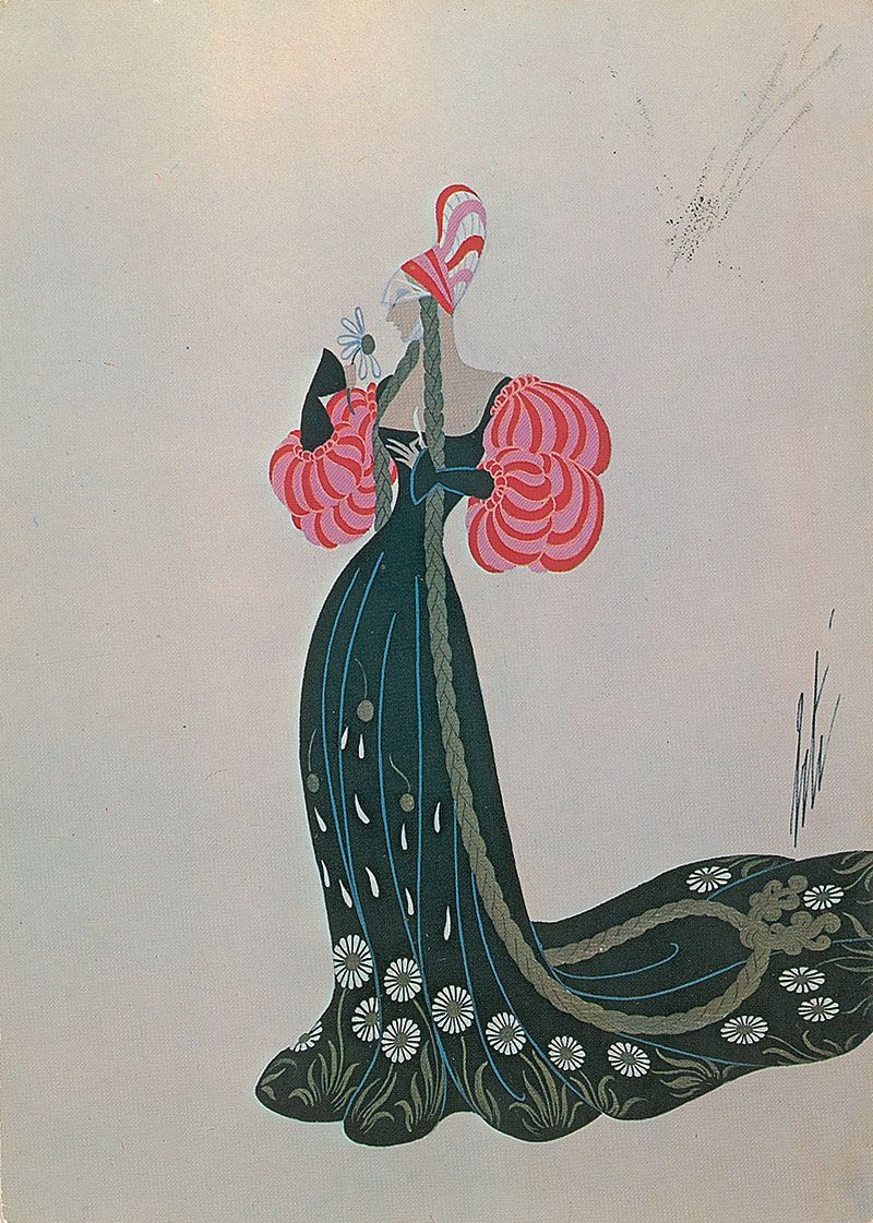 Color postcard of one of Erte’s works, 5 x 7, signed on the reverse in black felt tip, “Erte.” Also bears a pre-printed signature on the front, and an extremely faint signature attempt to the upper right, which failed due to irregular adhesion. In fine condition, with light creases to corner tips.