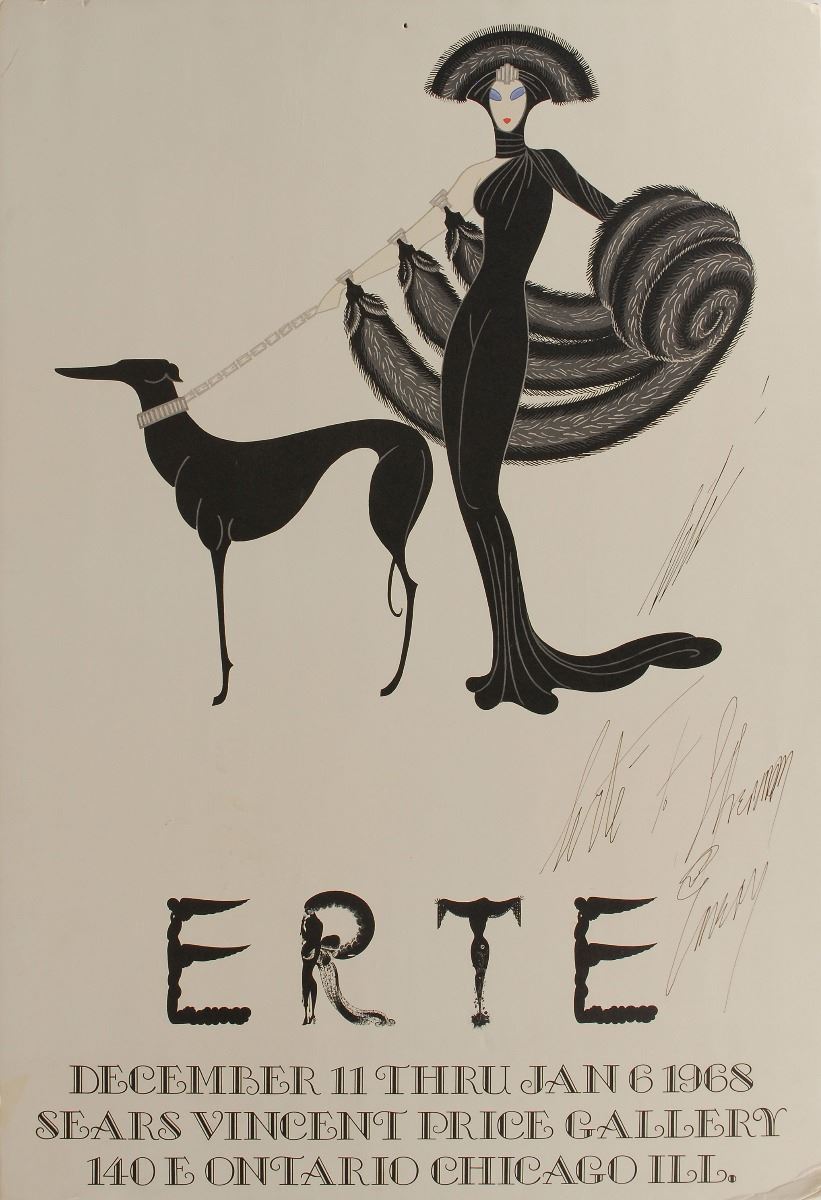 Art Deco–style color 19.75 x 29 poster for Erte’s exhibition at the Sears Vincent Price Gallery in Chicago from December 11–January 6, 1968, signed and inscribed in black felt tip, “Erte to Sherman Emery.” Mounted to a same-size sheet of foam core and in very good to fine condition, with creasing to lower right corner, a few edge dings, and a small hole to top center. Oversized.