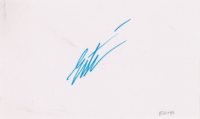 Pseudonym of Romain de Tirtoff (1892–1990), a Russian-born French artist and designer in an array of fields, including fashion, jewelry, graphic arts, costume and set design for film, theatre, and opera, and interior decor. Bright blue ink signature, "Erte,” on a white 5 x 3 card. In fine condition.