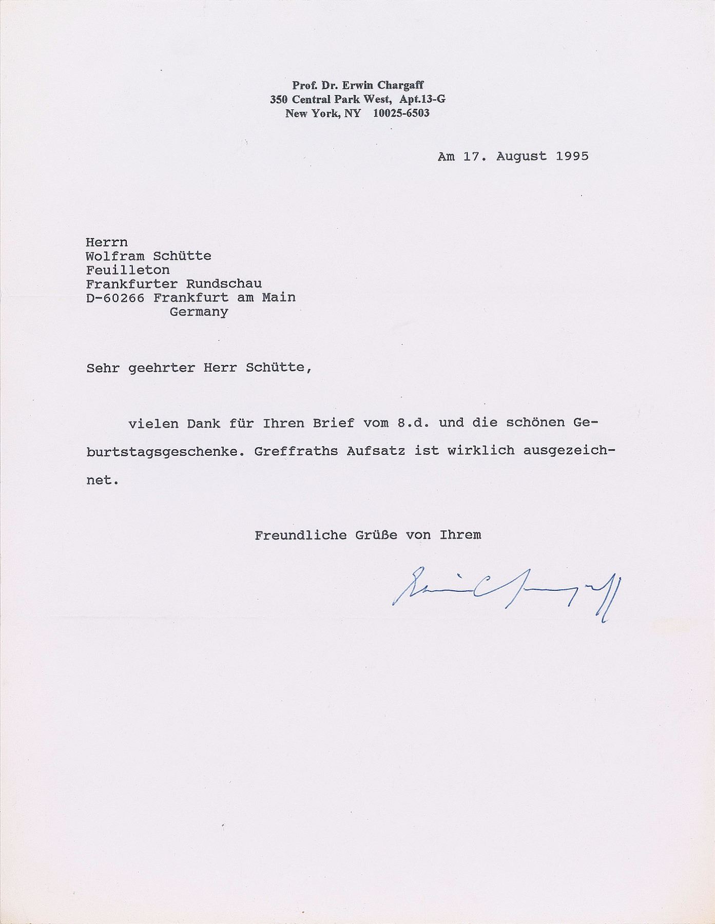 Biochemist (1905–2002) who discovered two rules that helped lead to the discovery of the double helix structure of DNA. TLS in German, one page, 8.5 x 11, personal letterhead, August 17, 1995. Letter to journalist Wolfram Schutte, in full (translated): "Many thanks for your letter of the 8th and the beautiful birthday gifts. Greffrath's essay is really excellent." In fine condition.
