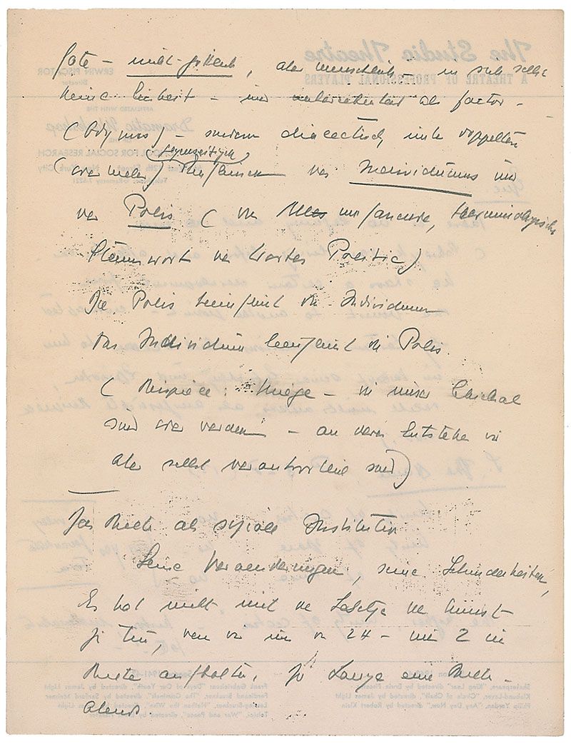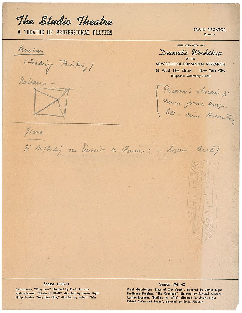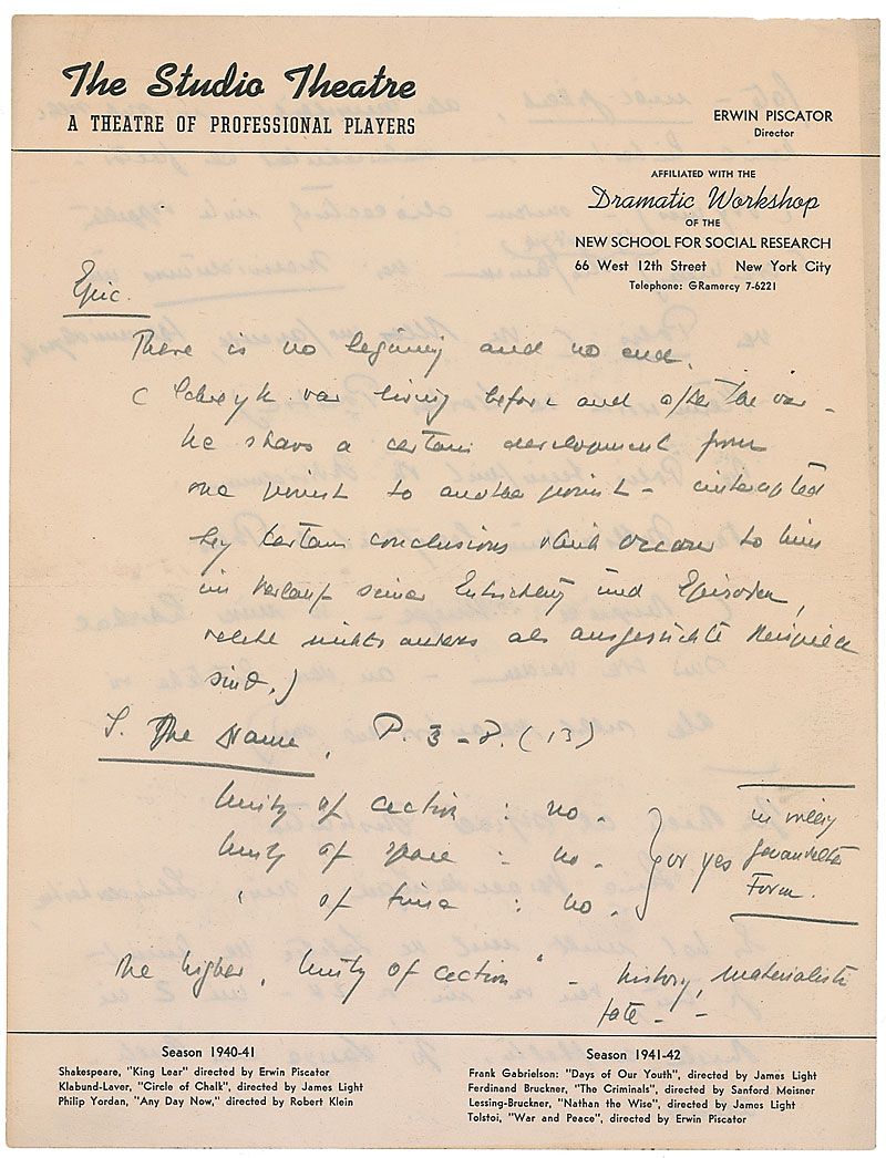 German stage director and producer (1893–1966) who was one of the foremost exponents of epic theatre. Unsigned autograph theatrical notes in pencil, three pages on two sheets, 8.5 x 11, The Studio Theatre letterhead, no date. Notes regarding dramatic form. In part: “Epic. There is no beginning and no end.” Piscator goes on to mention the ‘classical unities’ of drama from Aristotle's Poetics: “Unity of action…of time…of space.” Notes to reverse of the first page are in German. Overall toning to the second page, and a few tiny edge tears, otherwise fine condition.