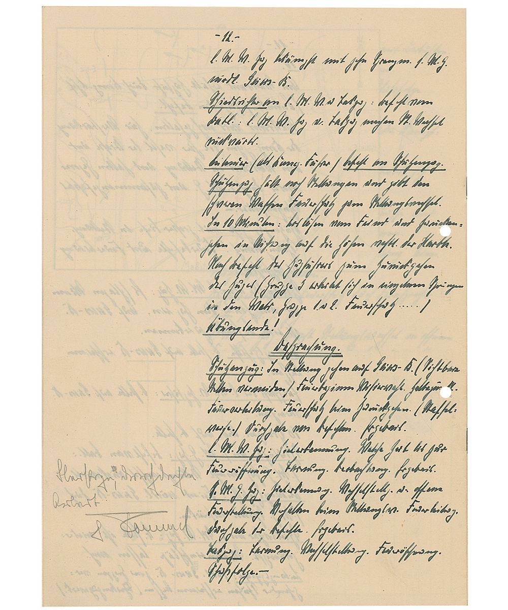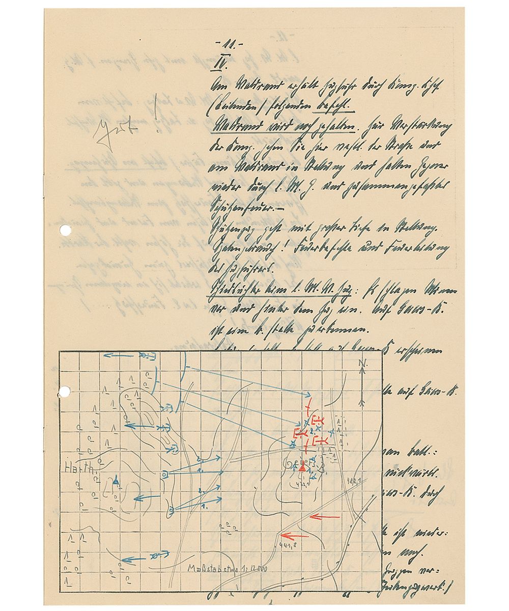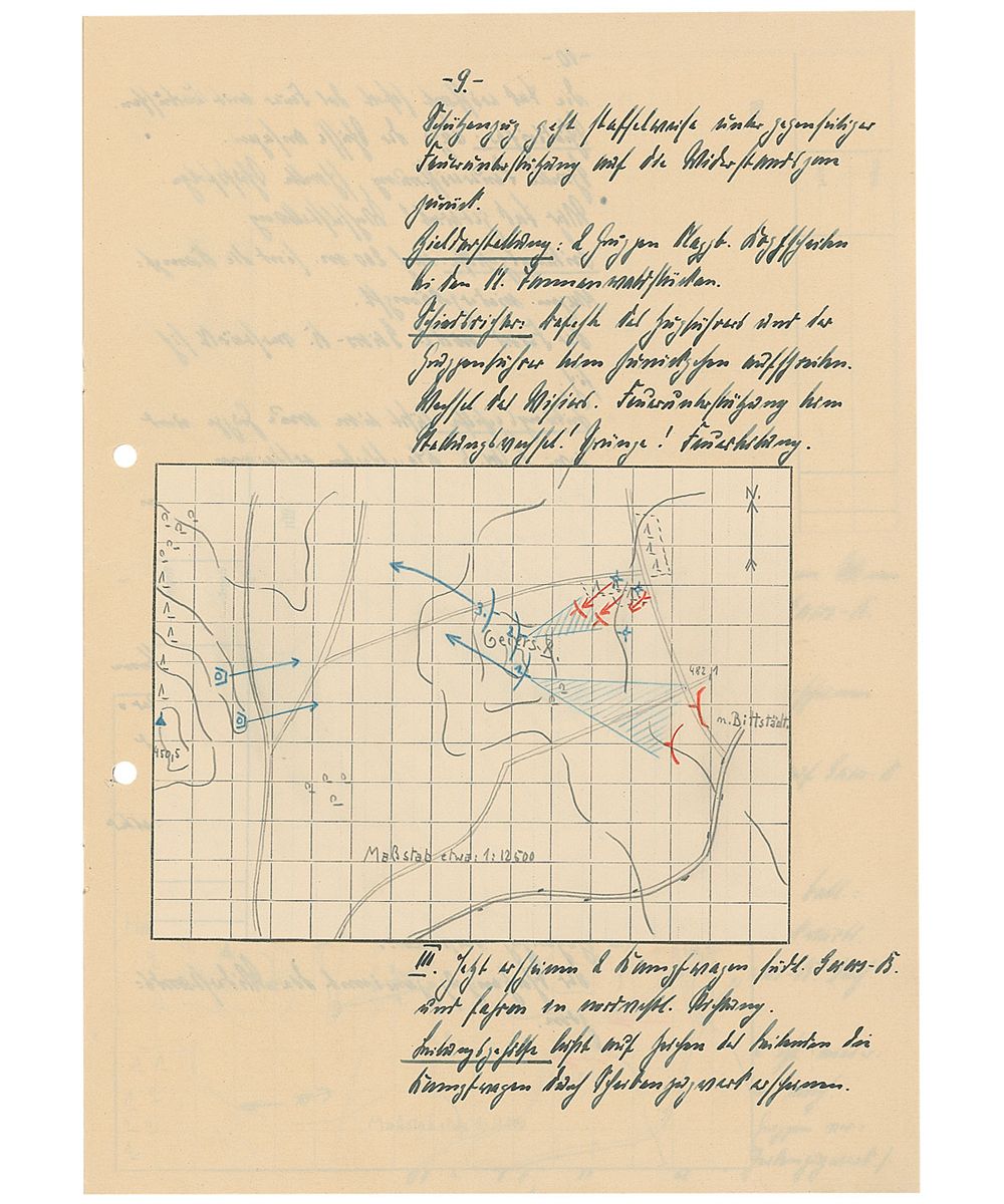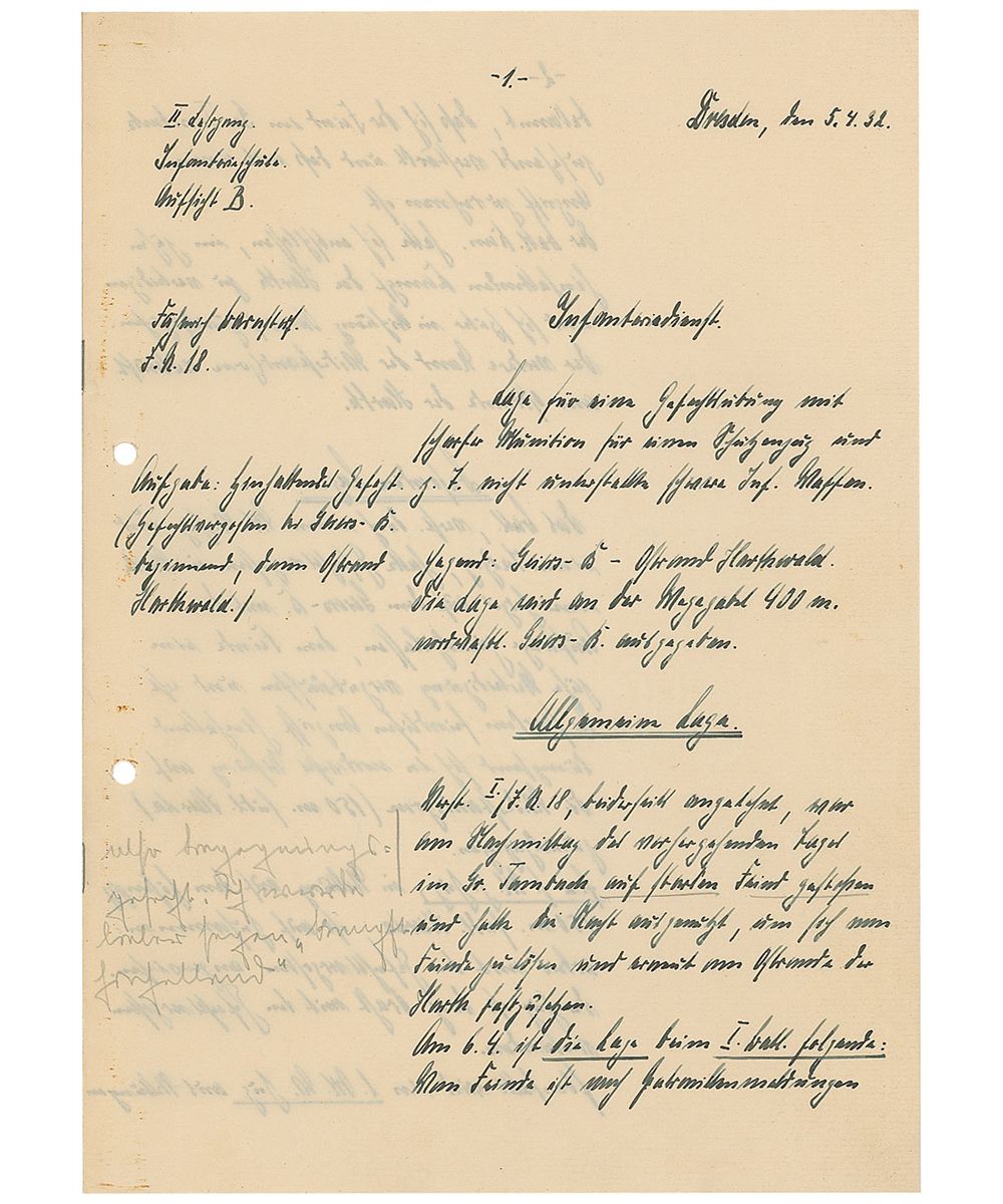Training text report in German by a student named “Barnstorf,” who at the time of the report was a flagbearer, twelve pages on six adjoining sheets, Dresden, April 5, 1932. Barnstorf’s initial report, entitled, “Infantry Service,” includes several color hand-drawn maps and reads (translated): “Practice skirmish with real ammunition and heavy artillery for an Infantry outpost. Location: Geiersberg, East of Harthwald. 400m from the fork of the two roads. Situation: In the afternoon of the previous day, the forward post in Great Tambuch ran into heavy fighting with the enemy. Used the night to retreat from the enemy and set up renewed positions at the eastern edge of Harth. On 4/6 the 1st battalion reported that the enemy numbers are increasing and an assault is expected. The 1st battalion had decided to defend their position and then later when retreating to return to the Eastern edge of Harth.”