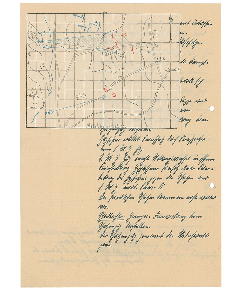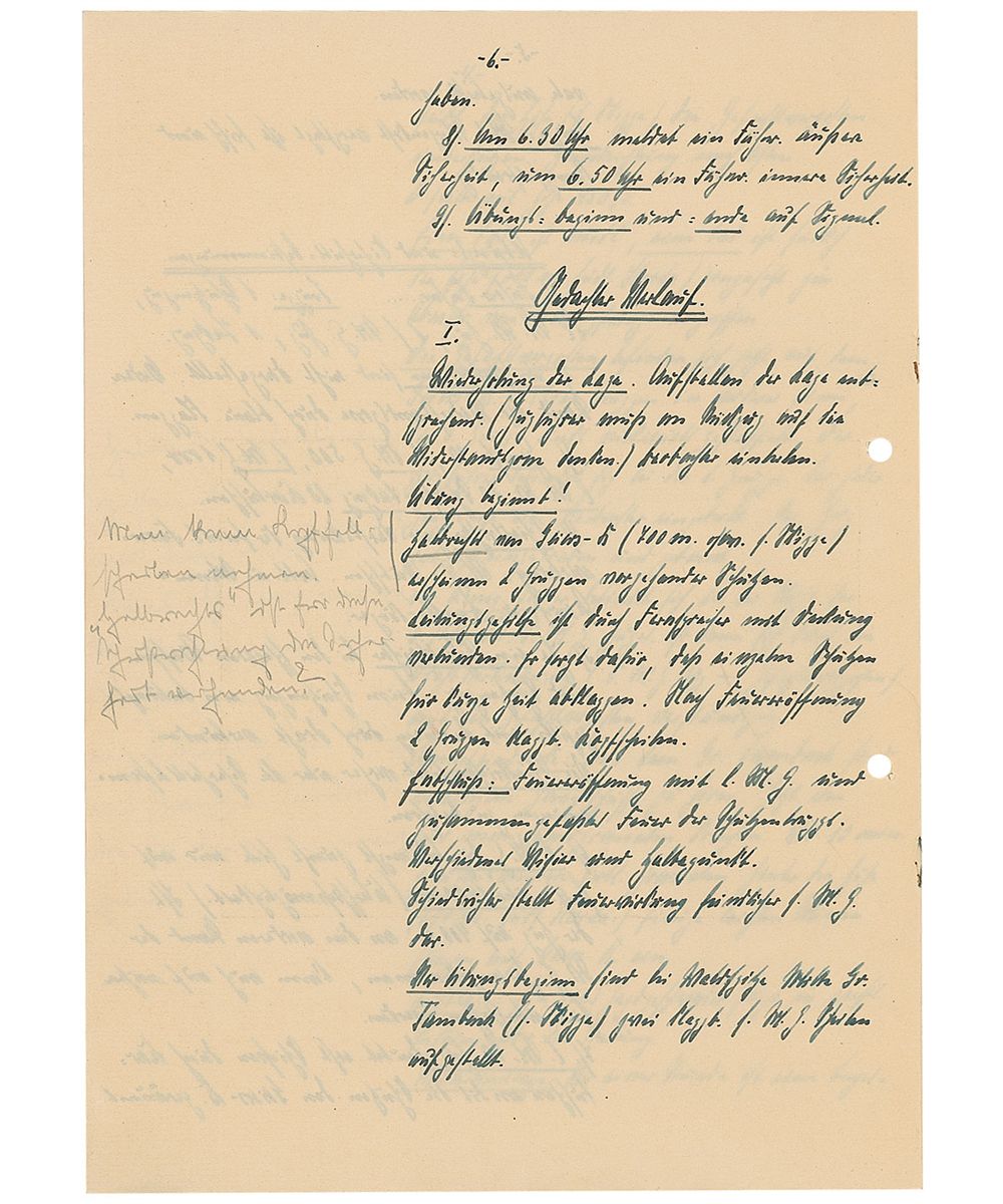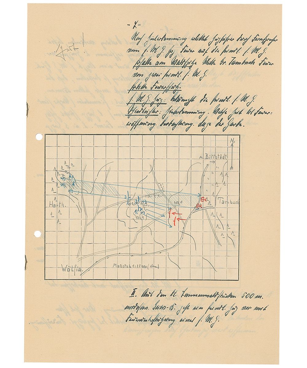 Training text report in German by a student named “Barnstorf,” who at the time of the report was a flagbearer, twelve pages on six adjoining sheets, Dresden, April 5, 1932. Barnstorf’s initial report, entitled, “Infantry Service,” includes several color hand-drawn maps and reads (translated): “Practice skirmish with real ammunition and heavy artillery for an Infantry outpost. Location: Geiersberg, East of Harthwald. 400m from the fork of the two roads. Situation: In the afternoon of the previous day, the forward post in Great Tambuch ran into heavy fighting with the enemy. Used the night to retreat from the enemy and set up renewed positions at the eastern edge of Harth. On 4/6 the 1st battalion reported that the enemy numbers are increasing and an assault is expected. The 1st battalion had decided to defend their position and then later when retreating to return to the Eastern edge of Harth.”