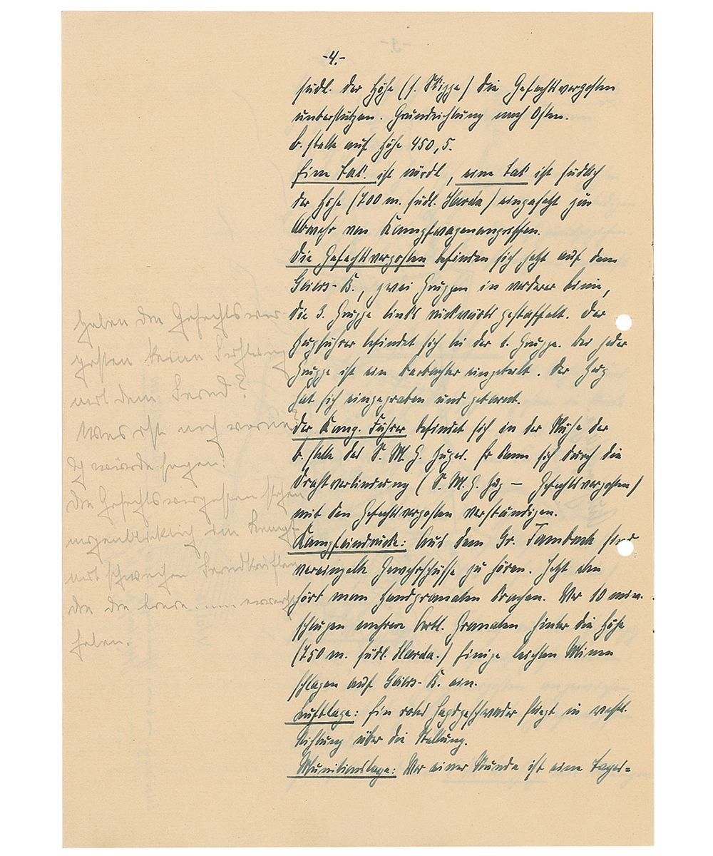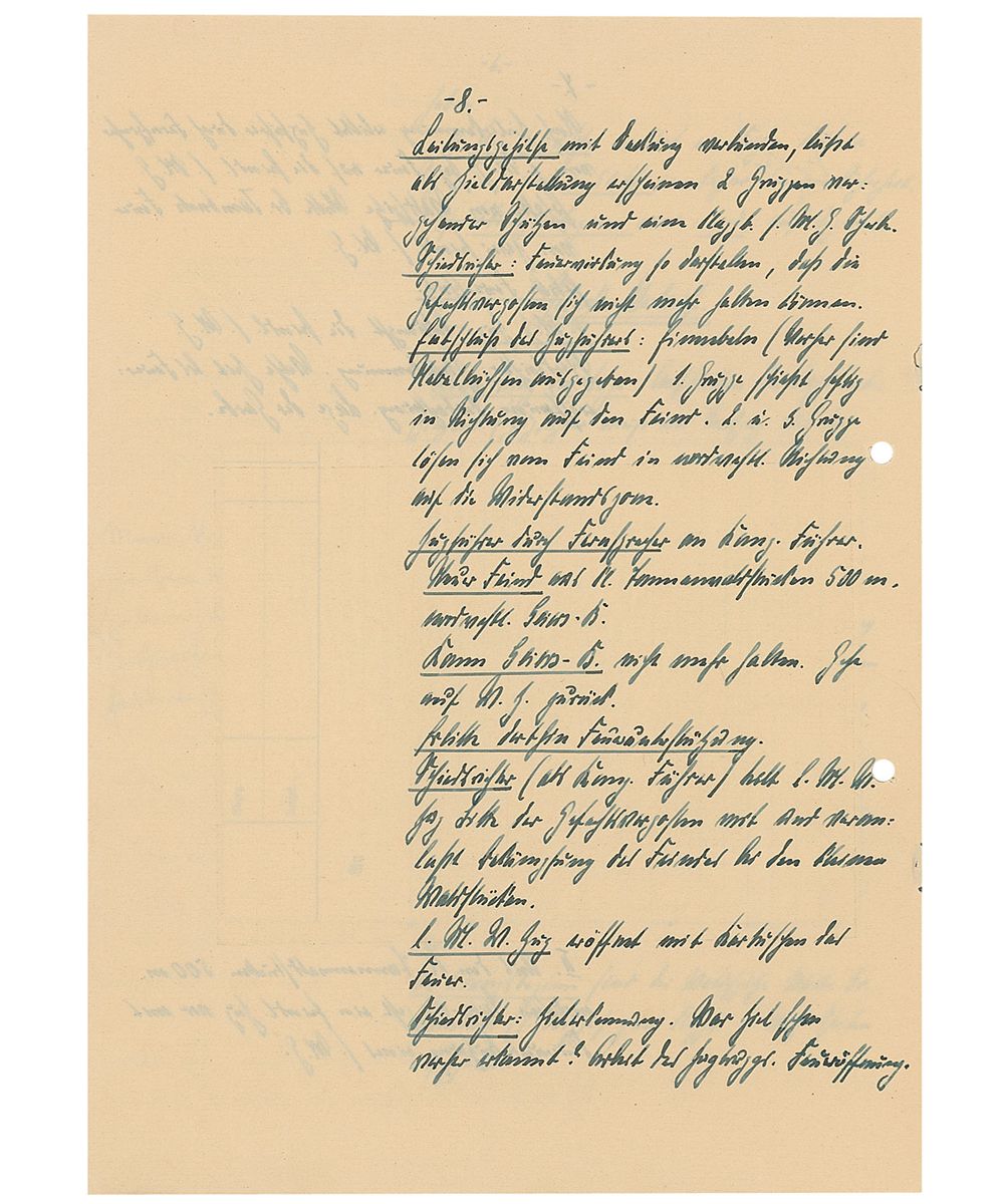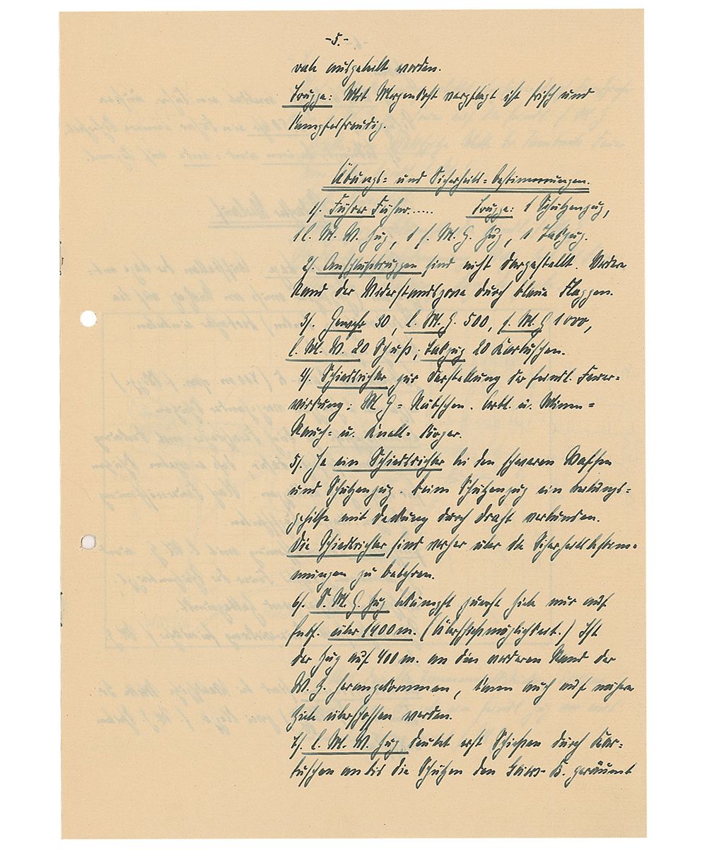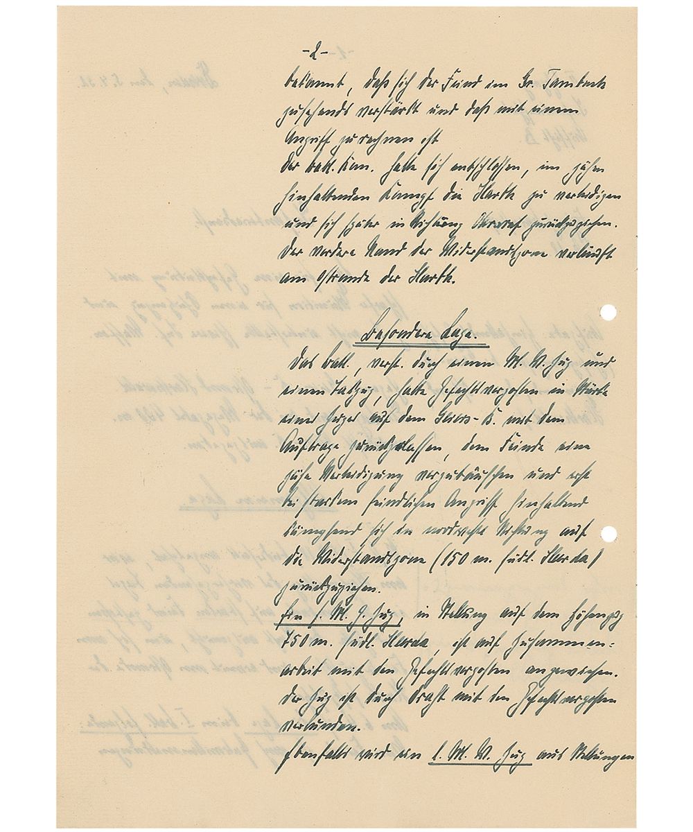 Training text report in German by a student named “Barnstorf,” who at the time of the report was a flagbearer, twelve pages on six adjoining sheets, Dresden, April 5, 1932. Barnstorf’s initial report, entitled, “Infantry Service,” includes several color hand-drawn maps and reads (translated): “Practice skirmish with real ammunition and heavy artillery for an Infantry outpost. Location: Geiersberg, East of Harthwald. 400m from the fork of the two roads. Situation: In the afternoon of the previous day, the forward post in Great Tambuch ran into heavy fighting with the enemy. Used the night to retreat from the enemy and set up renewed positions at the eastern edge of Harth. On 4/6 the 1st battalion reported that the enemy numbers are increasing and an assault is expected. The 1st battalion had decided to defend their position and then later when retreating to return to the Eastern edge of Harth.”