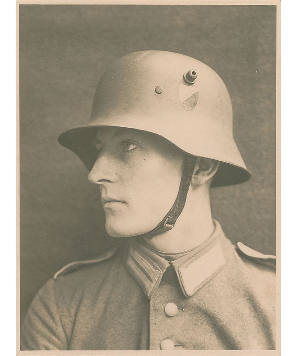 Rommel adds his pencil comments, which read, “Do the combat positions have any contact with the enemy? Who is still on the front? I would rather say: Fight while falling back (than retreating).” The report continues, “Special Situation: On its forward move, the battalion left some sharpshooters on the Geiersberg to give the enemy the impression of fighting while they were retreating. Machine Guns in position on the hill (700m). Another group is placed on the heights (Mippe). Wire communications exists among the groups. A Battalion is at 700m to defend any assaults from the enemy in vehicles. The soldiers on the Geiersberg are deployed as follows: Two groups on the front line. The third group is stationed in the rear in staggered positions. The leader is in group 1. Each group has an observer. The soldiers are dug in and camouflaged. The leader is in the vicinity of the shooters and is in contact with the soldiers by wire. Battle impressions: On the Great Tambuch some gunshots and hand grenades. Hand grenades also at Gross Alm (750m) and on the meadows at Geiersberg. Air Space: A formation of planes flew over the area. Ammunition situation: An hour ago an ammo depot was set up.” At the conclusion, Rommel offers his comments on the entire paper, “Diligent, Well thought out presentation. E. Rommel.” Report comes with its original folder and a postcard photo of Barnstorf in his uniform and helmet. In fine condition.