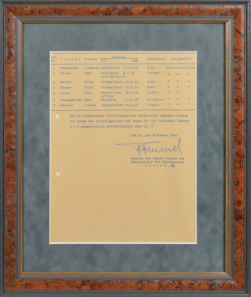 War-dated DS in German, signed “Rommel,” one page, 8 x 10.5, January 6, 1942. Untranslated document in which Rommel nominates a group of German soldiers to receive a service medal, prominently signed at the conclusion in indelible pencil by Rommel as Commanding General of the Panzer Army in North Africa. Archivally matted and framed to an overall size of 13.75 x 16. In fine condition.