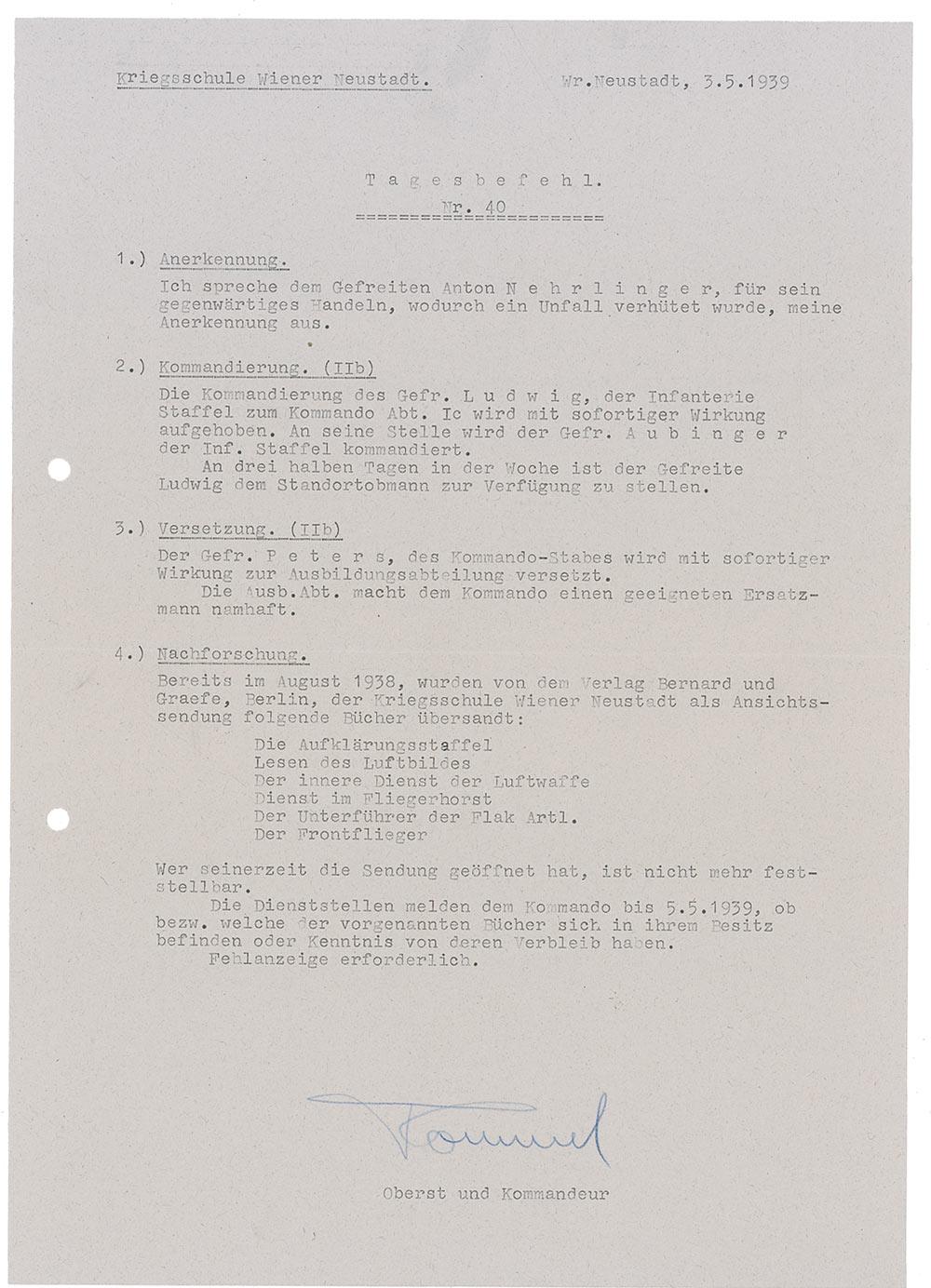 German field marshal (1891–1944) who earned the sobriquet ‘The Desert Fox’ for his tactical genius as Commander of the Afrika Korps. In 1944 he was implicated in a plot to assassinate Hitler; given the choice of suicide or a trial, he ended his own life with poison. DS, in German, signed in pencil, “Rommel,” one page, 8.25 x 11.5, March 5, 1939. Untranslated four-item document, signed at the conclusion in blue pencil by Rommel as Oberst und Kommandeur (Colonel and Commander). Document bears secretarial notations on the reverse. In fine, clean, condition, with a central horizontal fold and punch holes to left edge.