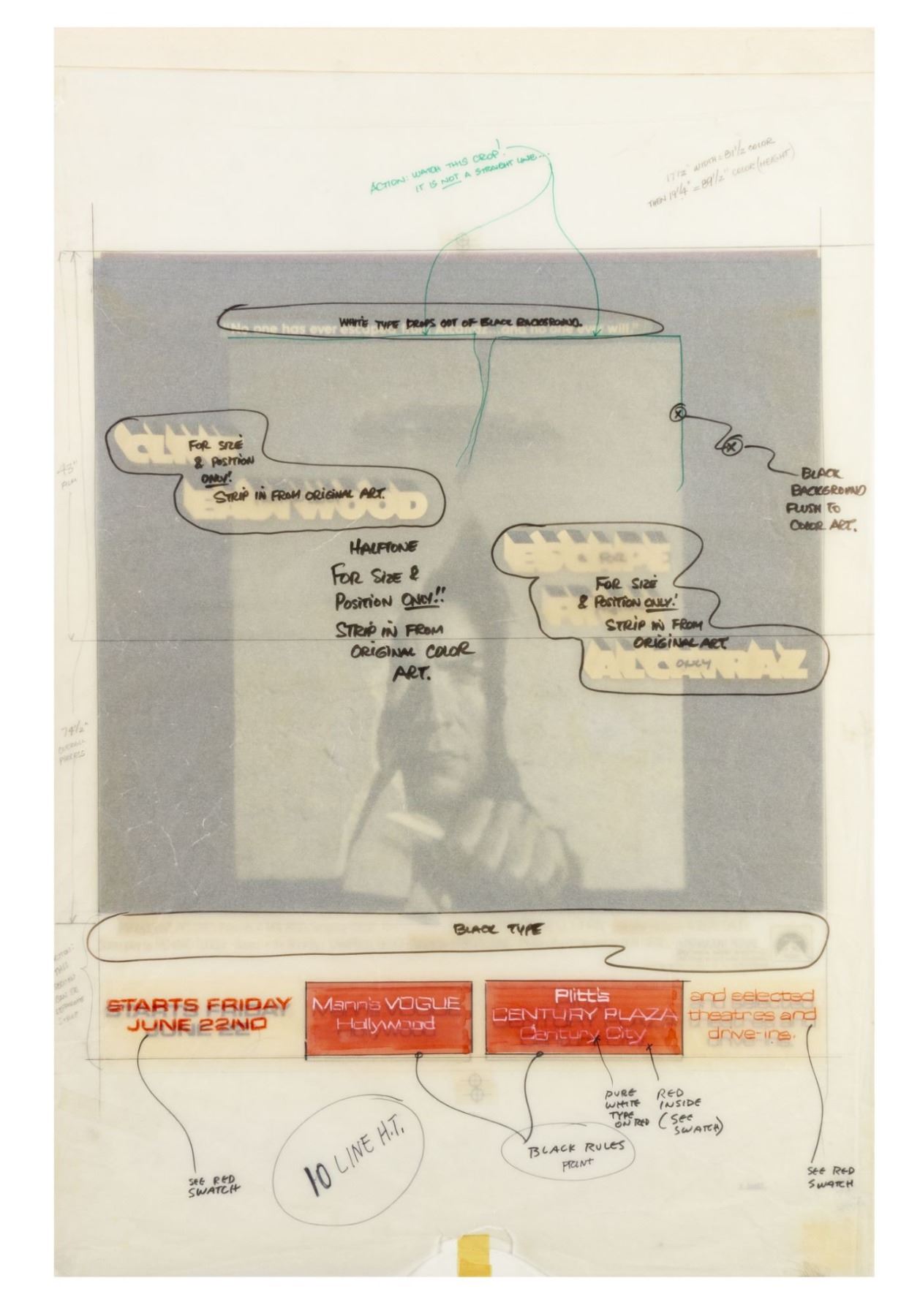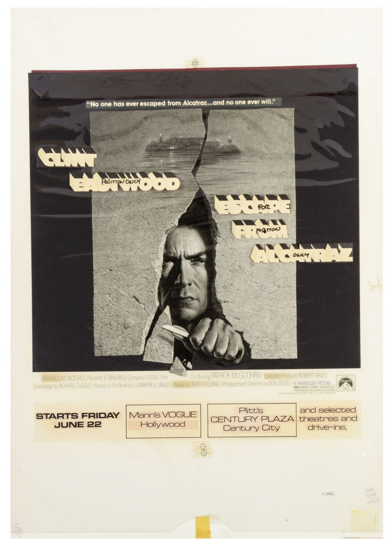 (Paramount, 1979) Original development artwork for a movie poster for "Escape from Alcatraz" starring Clint Eastwood. This artwork comes from the collection of Bill Wallen, and features hand-trimmed and applied printed artwork over an art board backing. Below the artwork, hand-trimmed and applied production text and theatre specific text is listed, and over the artwork, a clear sheet is hinged over the top with applied text of "Clint Eastwood" and "Escape from Alcatraz". These last two portions of text have the words "for position only" written on them, which is a printing term that specifies that the imagery used is not the final imagery. "For Placement Only" or "F.P.O." development artwork such as this, allows the design team to continue working on the project while aspects of the final artwork are still being completed. This artwork provides a rare glimpse into the creation of promotional materials for this iconic film, and measures 30"x20". The condition is very good with some tape residue and minor wear around the edges of the board. There is a vellum sheet hinged over the top of the artwork that has some tears throughout, and there is yellowing to the back-side of the art board.