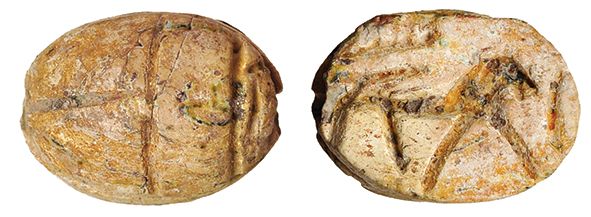 Escarabeo II Periodo Intermedio (1785-1532 a.C.). Representa león a derecha con pluma (Maat) y cobra (Ureus). Fayenza. Longitud 1,5 cm.