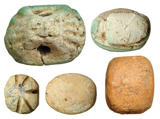 Escarabeos II Periodo Intermedio (1785-1532 a.C.). Lote de un escarabeo, tres escaraboides y un sello real (total 5). Fayenza y hueso. El sello representa simbología ramesida y uno de los escaraboides un león a derecha con pluma (Maat) y cobra (Ureus). Longitud de 0,8 a 1,9 cm.