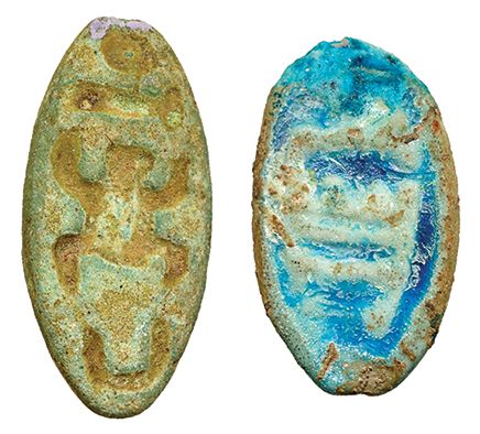 Escarabeos II Periodo Intermedio (1785-1532 a.C.). Lote dos escaraboides. Fayenza vitrificada en azul y verde. Simbología ramesida y de Tutmosis III. Imperio Nuevo (1554-1075 a.C.). Longitud 1,5 y 1,8 cm.