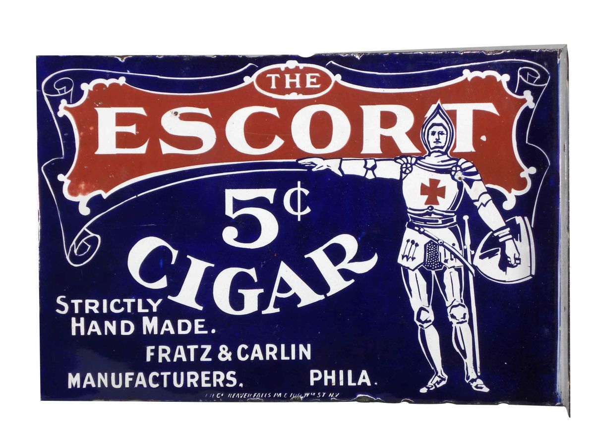 Escort 5 Cent Cigars Porcelain Flange Sign. Strictly Hand Made Fratz & Carlin Mfg. Phila. Some professional restoration, rust around the perimeter otherwise good condition. 18 X 12 inches.