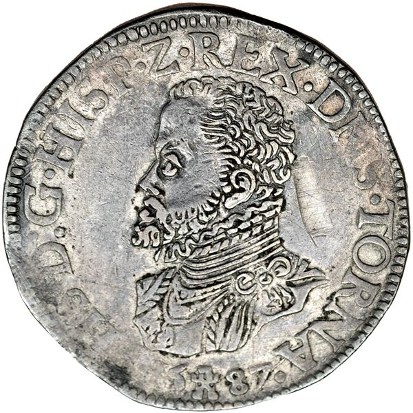 Escudo Felipe. 1587. Tournai DL-I, 45. DAV-8655. Limadura en el anv. y defectos de cospel. MBC.
