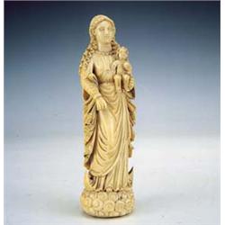 Escuela indoportuguesa, S.XVII. "Virgen con el Niño" Altura : 22 cms. Marfíl tallado con restos de policromía. Falta un brazo del Niño.
