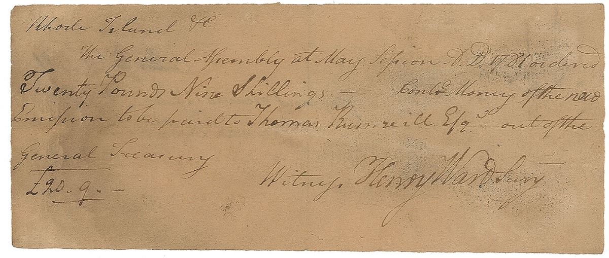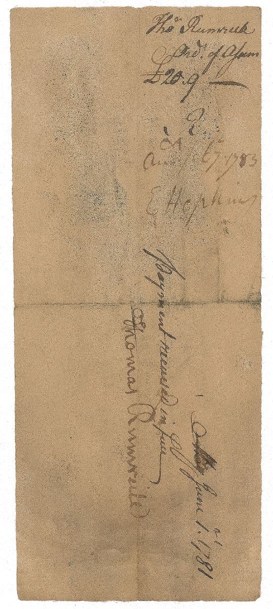 Famed Rhode Island commodore (1718—1802) who served as Commander in Chief of the Continental Navy during the American Revolutionary War. Manuscript DS, signed “E. Hopkins,” one page both sides, 6.25 x 2.5, June 1, 1781. Receipt of payment for “Twenty Pounds Nine Shillings…to be paid to Thomas Rumville Esq. out of the General Treasury.” Signed on the reverse by Hopkins, who dates the receipt to 1783. In very good condition, with moderate overall soiling and Hopkins’ signature a bit light.
