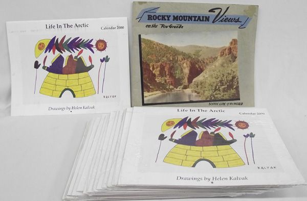 Sixteen Eskimo 2000 Calendars - 1946 Rio Grande Railroad Pamphlet . Collection of 16 Eskimo Calendar, ready to frame prints, year 2000, by Helen Kalvak. Measure 8.5 x 11''. The 1946 booklet ''ROCKY MOUNTAIN VIEWS ON THE RIO GRANDE'' colored views from photographs. Measures 10''H x 11W'