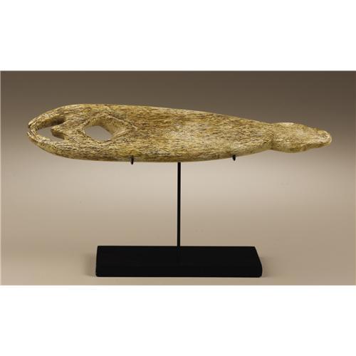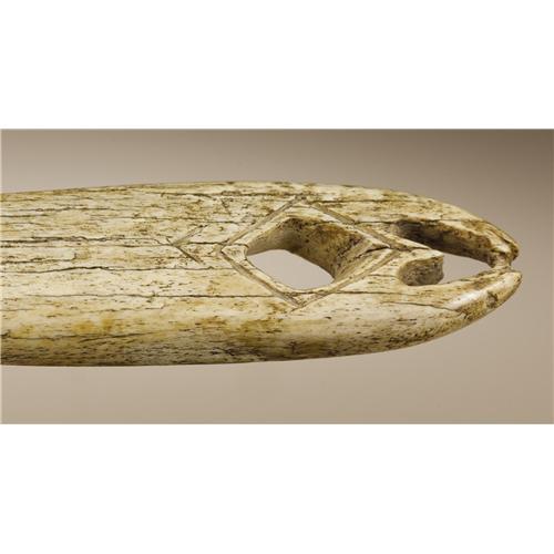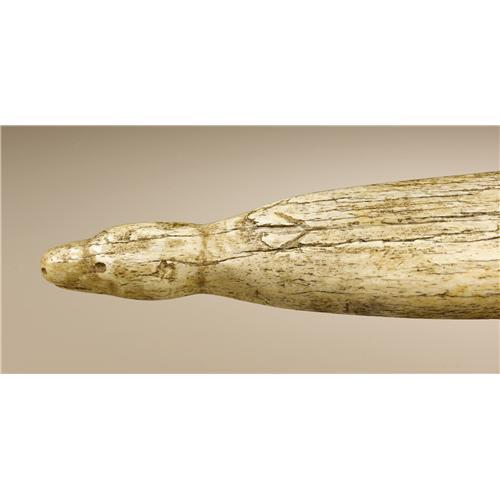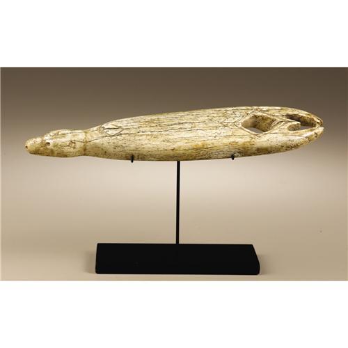 <B>Eskimo Arrow Straightener</B></I><BR>Circa 1880<BR>Length 9 in. Width 1 3/4 in.<BR><BR>"The arrowshaft straightener is a vital implement in a hunter's tool kit, and is used to straighten the wooden shafts of arrows used to hunt caribou, birds, and fish. Arrowshaft straighteners are usually made out of tough fossil ivory which is found eroding out of thawing permafrost banks." This carved bone example depicts a swimming polar bear. (For related examples see: Hoffman, Walter, "The Graphic Art of the Eskimos", <I>Smithsonian Institution Annual Report for 1895,</B></I> Washington, D.C., 1897, Plates 7 and 8.)<BR><BR>Provenance<BR>Merrill Domas, Old Chatham, New York.<BR><BR>Reference<BR>Fitzhugh, William and Kaplan, Susan, <I>Inua: Spirit World of the Bering Sea Eskimo,</B></I> Smithsonian Institution Press, Washington, D.C., 1982, p. 56.<BR><BR> <BR><BR><B>Important noti