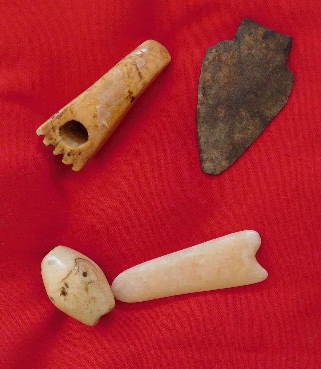 Prehistoric Eskimo Artifact collection made from slate and walrus bone. The point is the longest and measures 2 inches. This items are as found. See pictures. Frame is not included. Shipping: $28