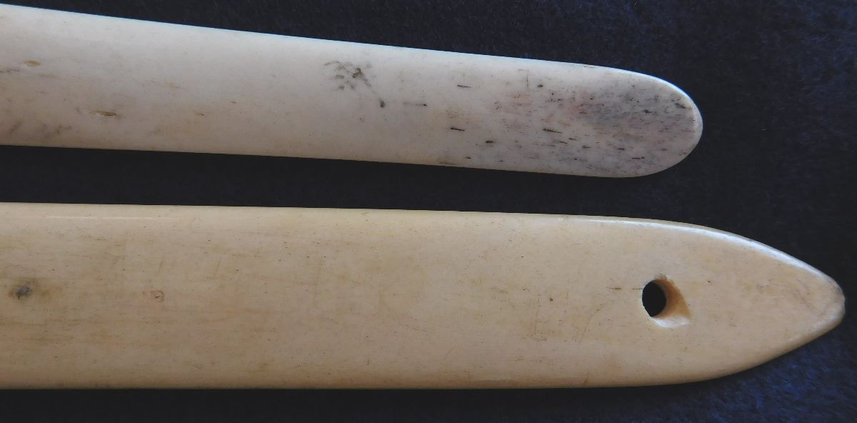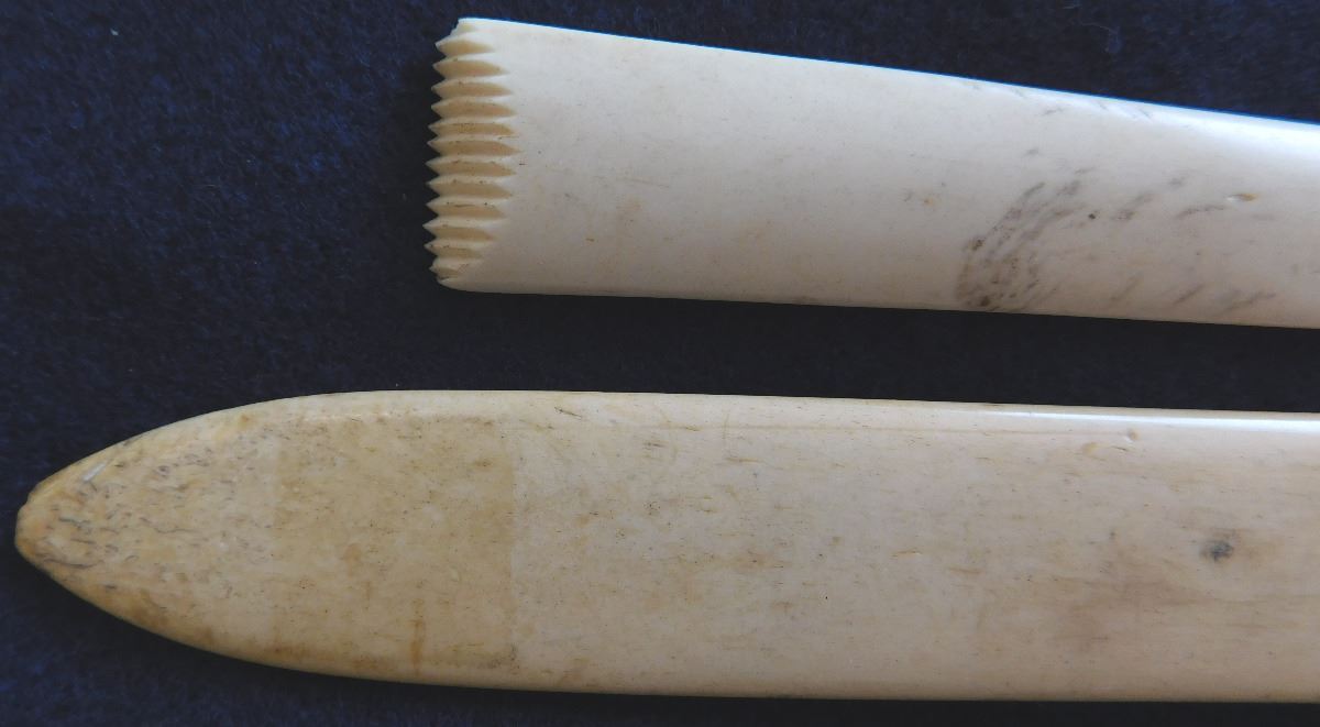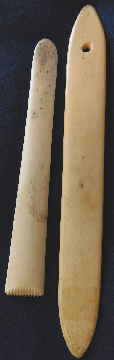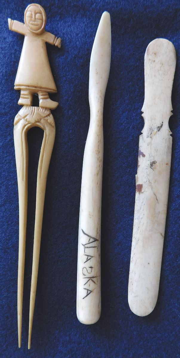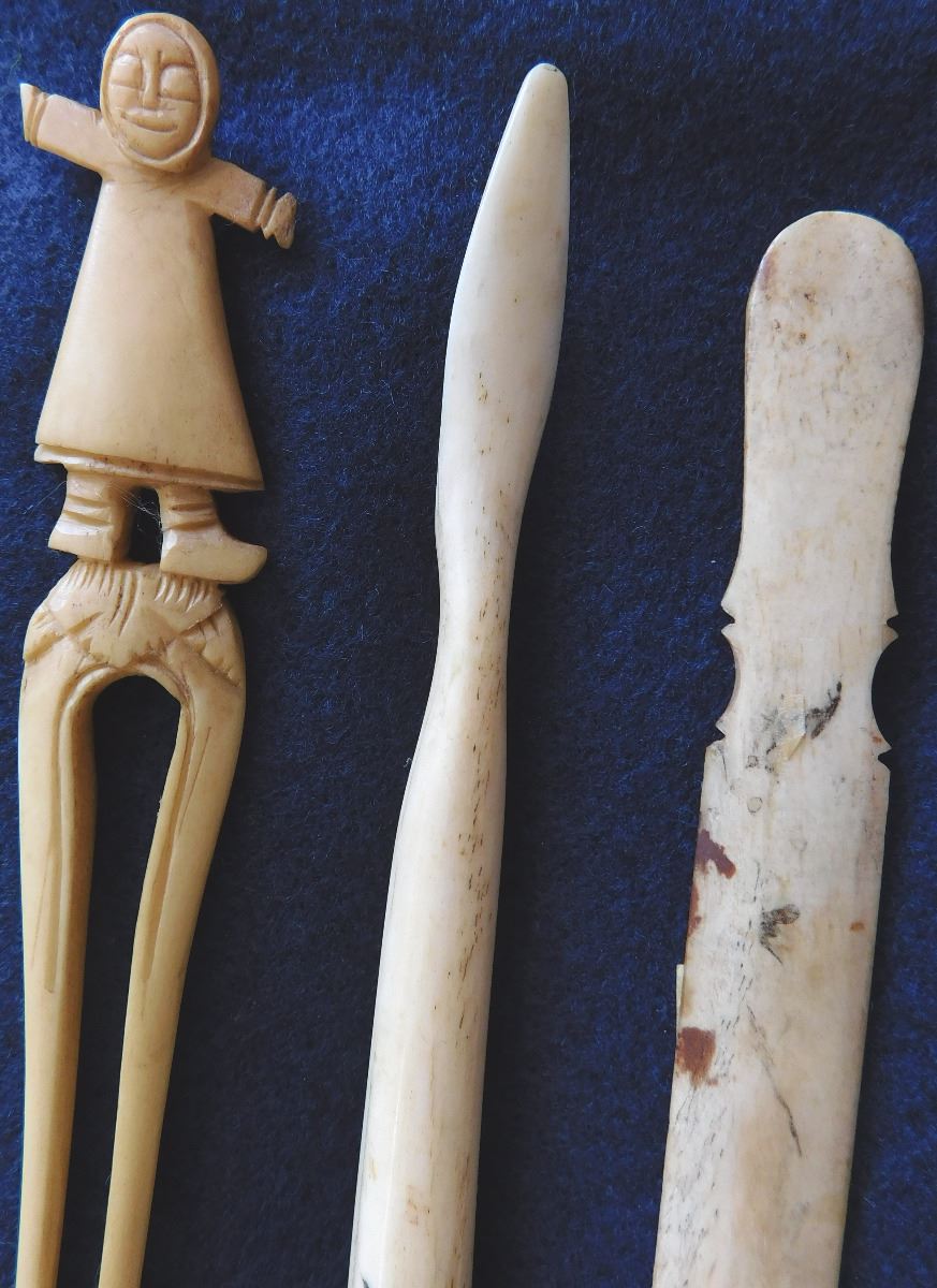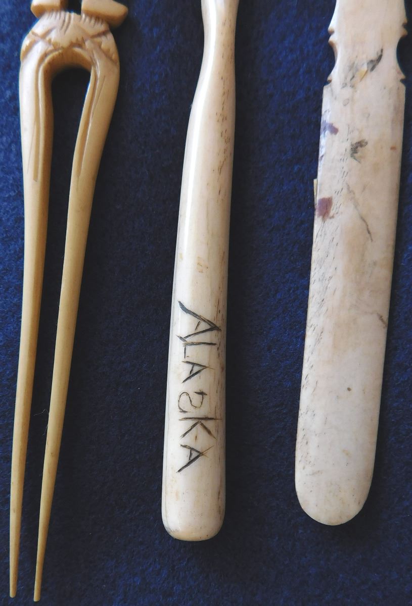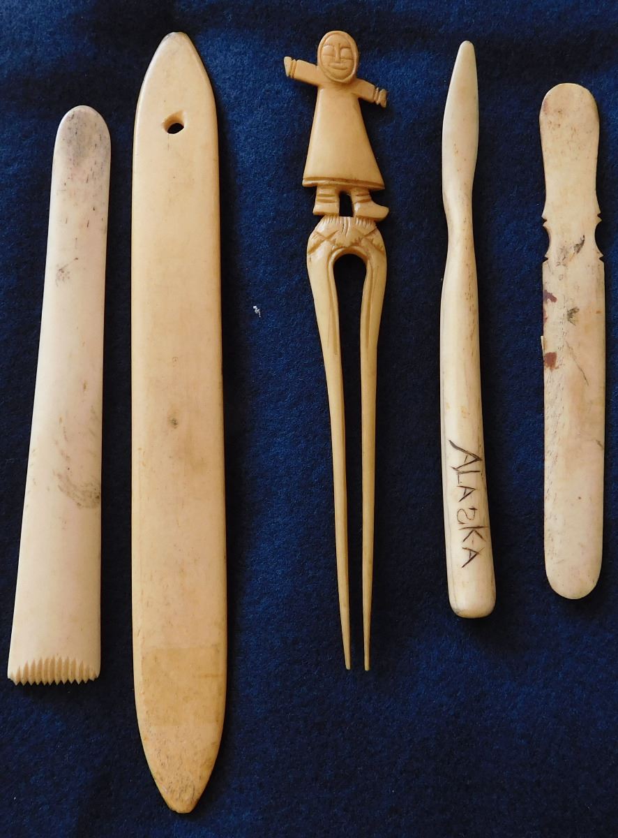 Eskimo Artifact Collection, early historic. Made of walrus bone, the largest item is 7.75". From Alaska, Eskimo. Rare hair pin with human effigy. Frame not included. Condition: Nice, see images. Shipping: $24.50.