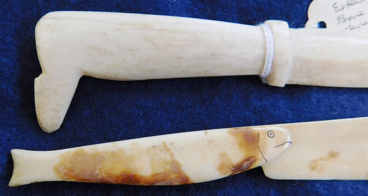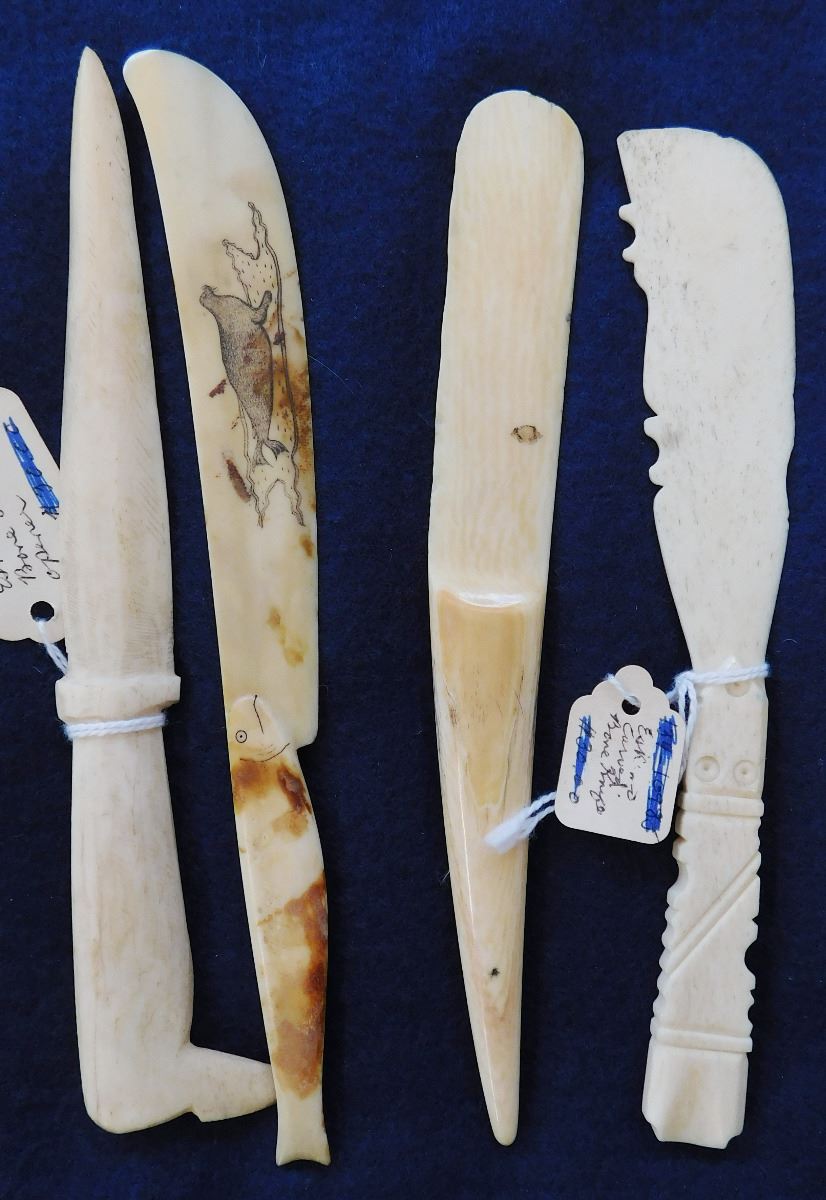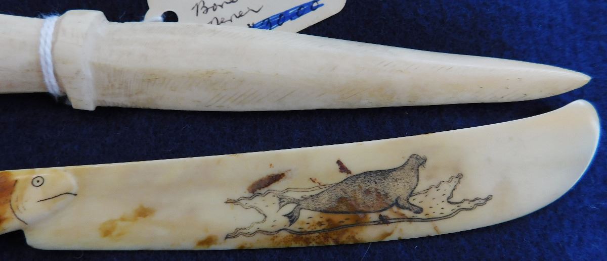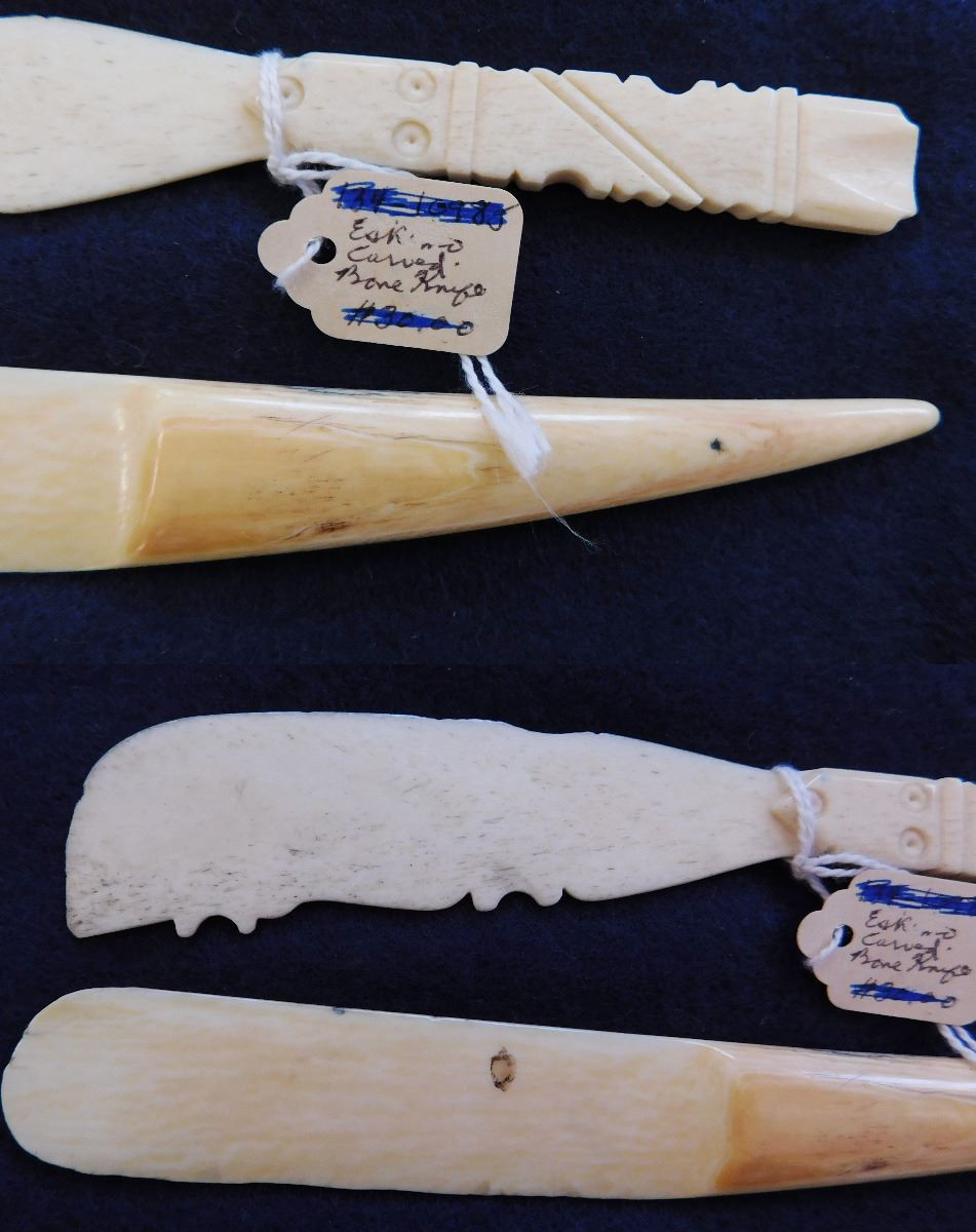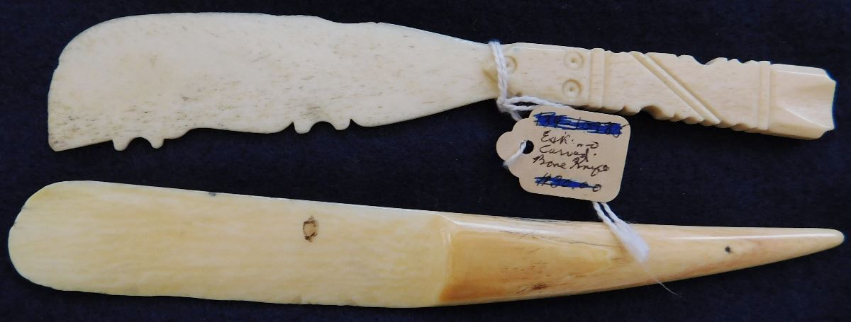 Eskimo Artifact Collection, early historic period. Made of walrus bone, the largest item measures 7.75". Eskimo item, from Alaska. Note the schrimshaw on one knife. Frame not included. Condition: Good, see images. Shipping: $25.50.