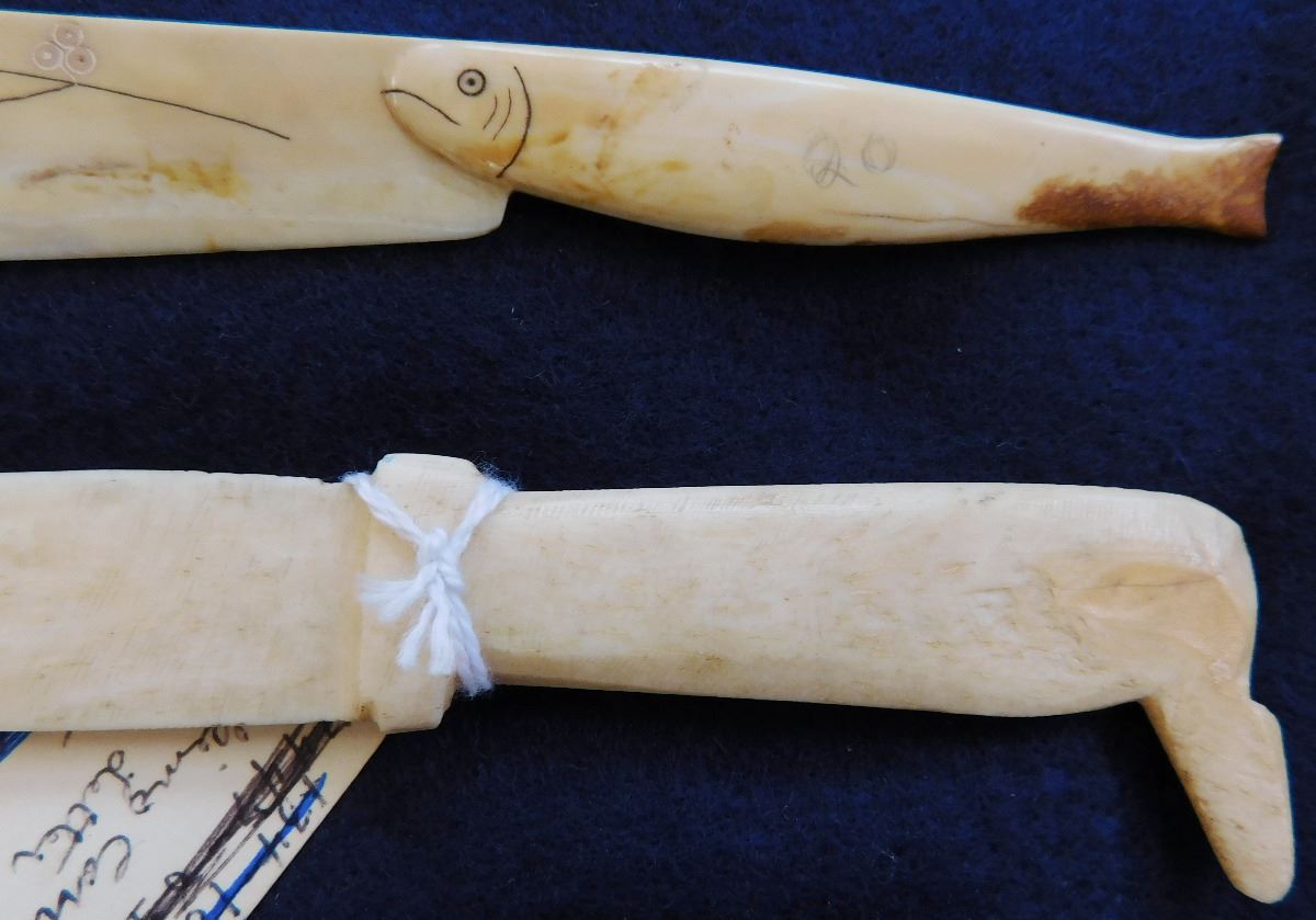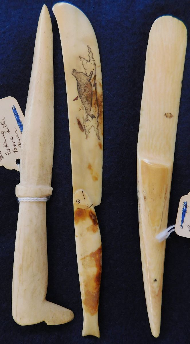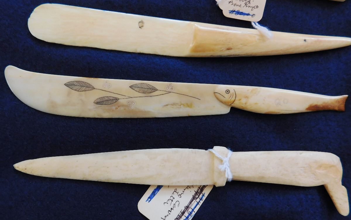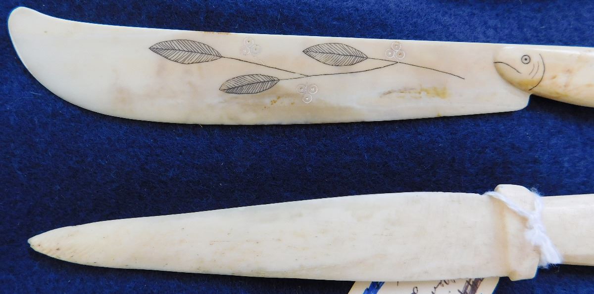 Eskimo Artifact Collection, early historic period. Made of walrus bone, the largest item measures 7.75". Eskimo item, from Alaska. Note the schrimshaw on one knife. Frame not included. Condition: Good, see images. Shipping: $25.50.