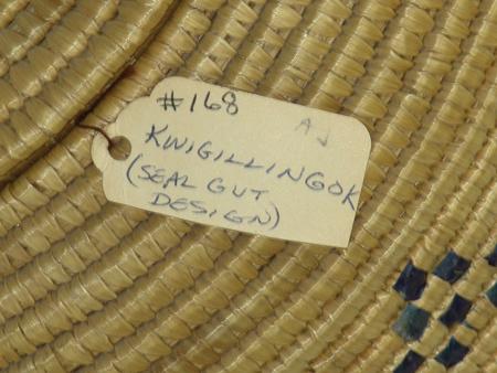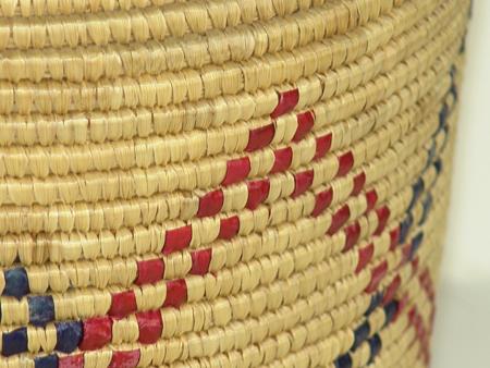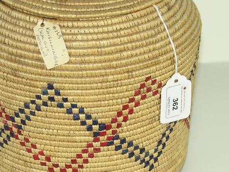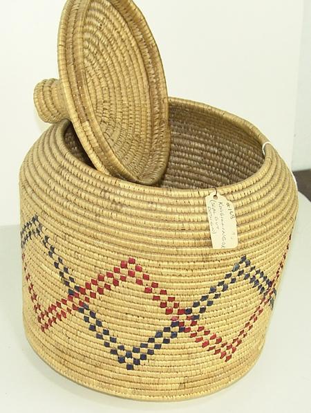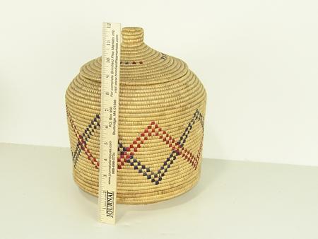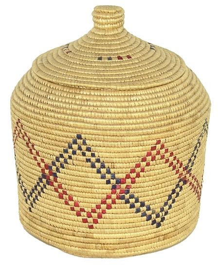 Circa Mid 1900s, Classic upright lidded basket with polychrome designs made from dyed seagrass. Excellent condition. 11" x 9"