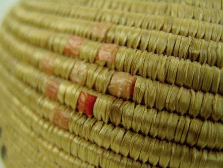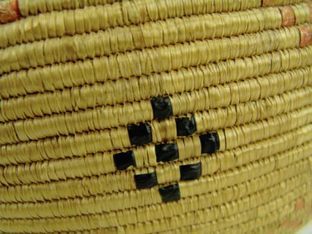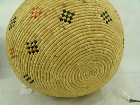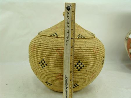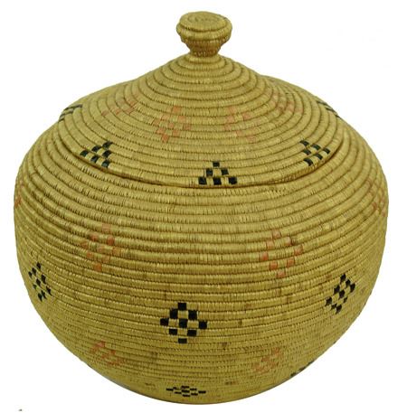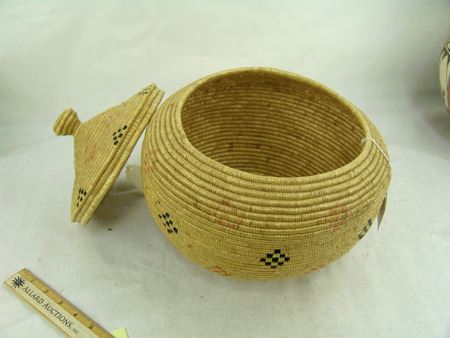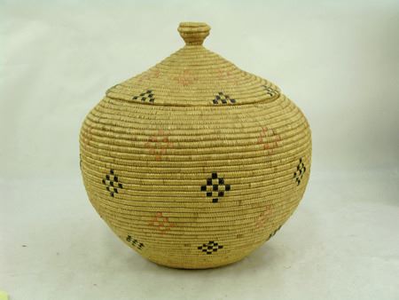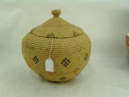 Ca. 1920s, Unusually large fine weave lidded storage basket with checked diamond symbols made from dyed seal gut. Very good condition, with very minor stitch loss damage. 12" x 11"