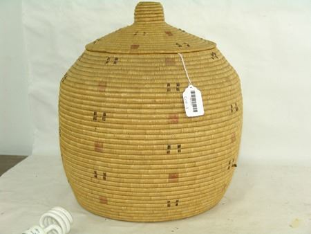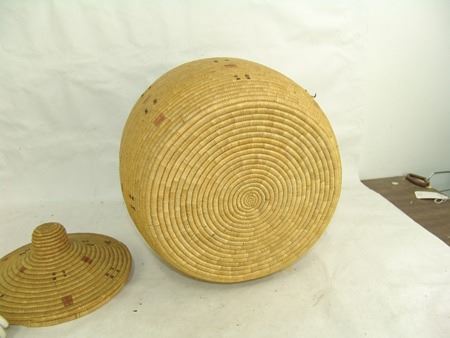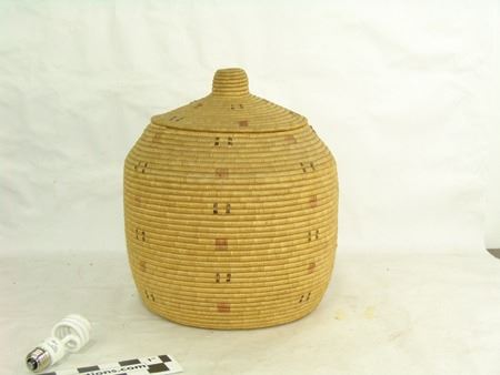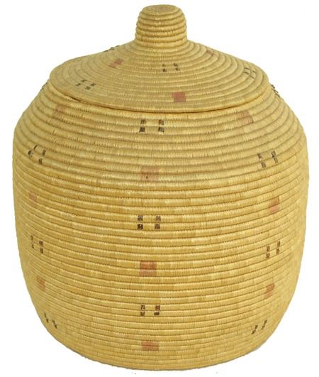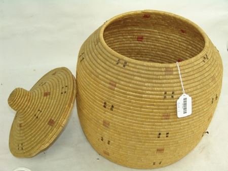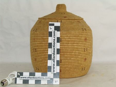 Early 1900s, Rather large lidded storage basket with small design symbols made from dyed seal gut and sea grass. Very good condition, great patina. Very minor stitch loss. 15" x 15"