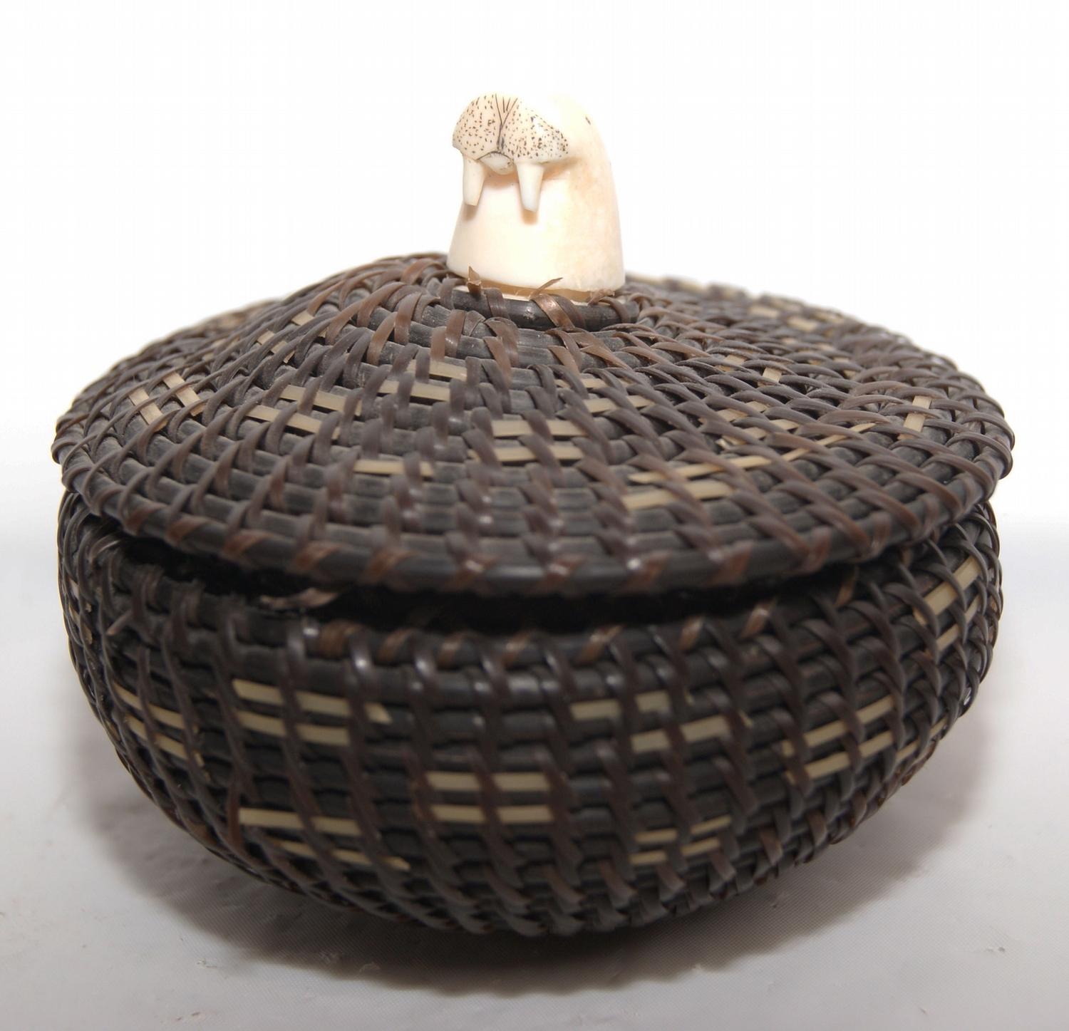 1969 baleen with carved ivory walrus head, minor stitch loss, maker Barrow Alaska 3" x 4"