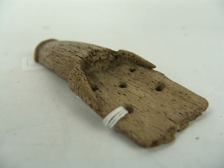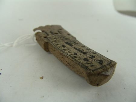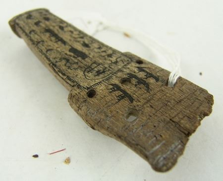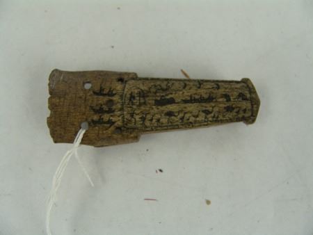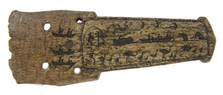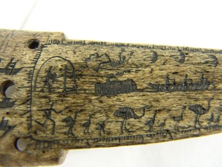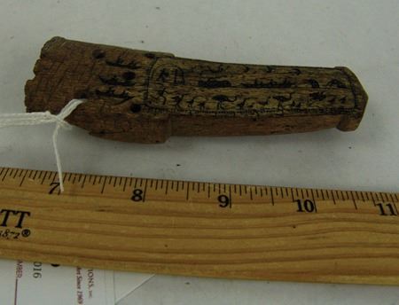 Mid 1800s, Very old excavated carved bone bow/atlatl tip(?) with fine scrimshaw figures. 4-5/8" x 1-3/4" x 3/4"