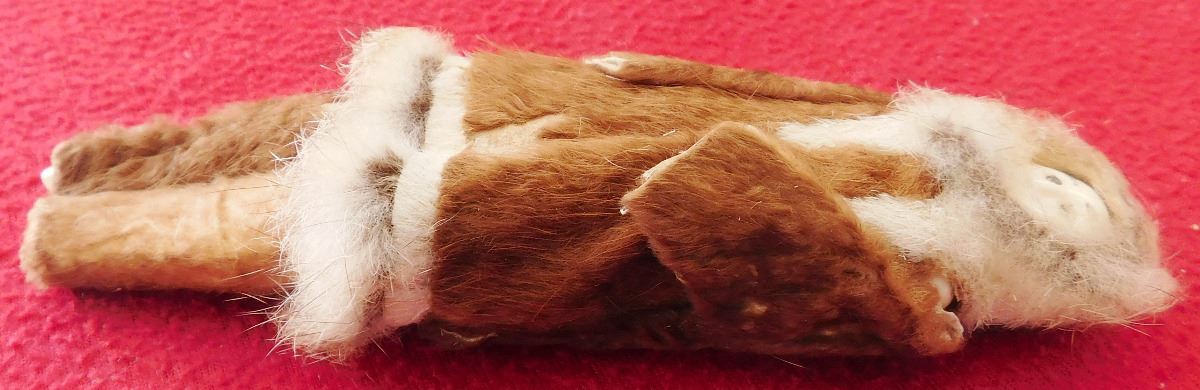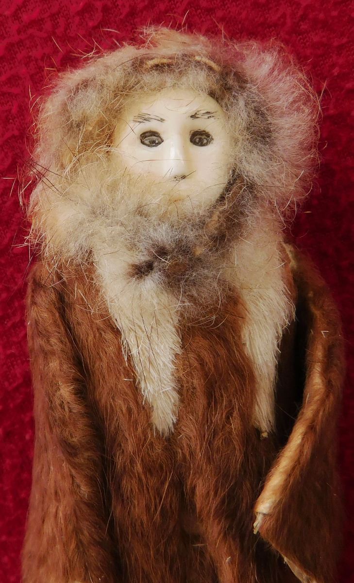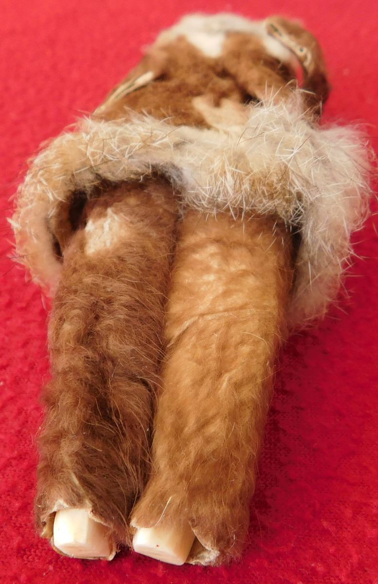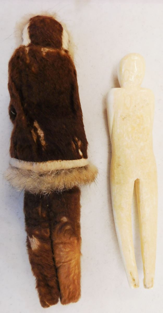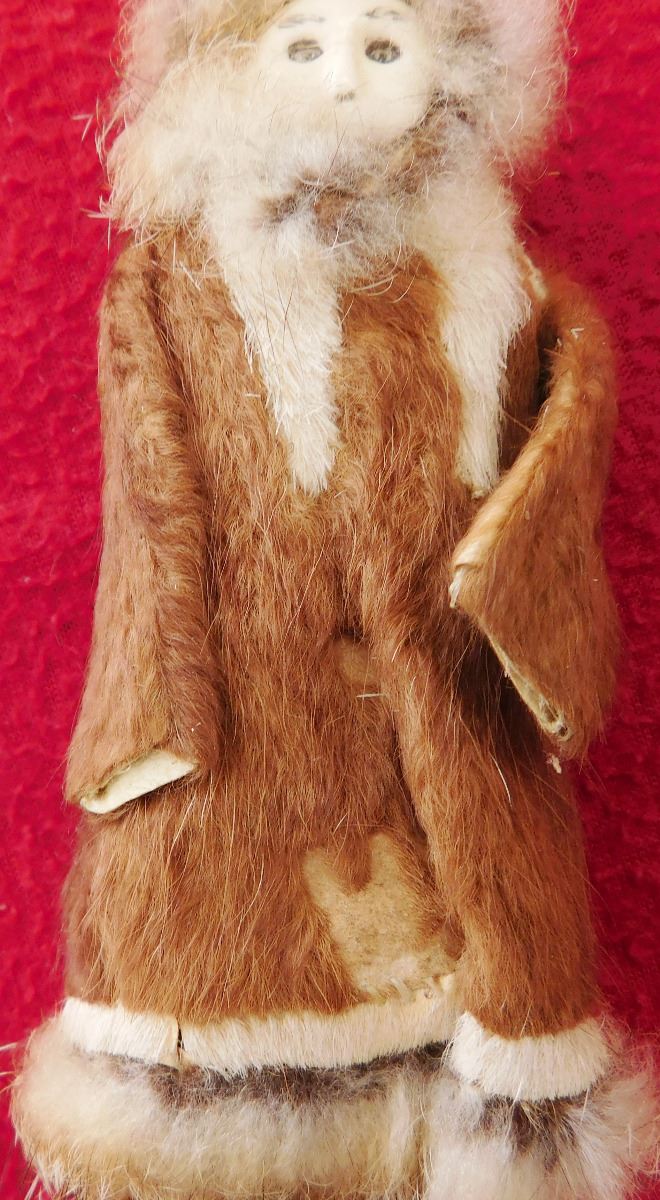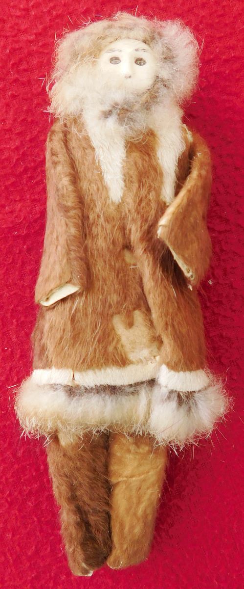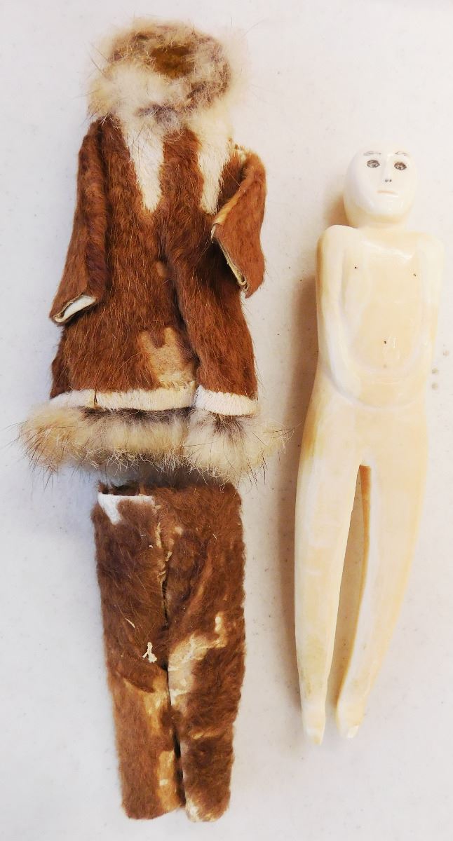 Eskimo Bone Doll w/Clothes, circa 1890s. Made of animal skin and bone, the item measures 2" x 1.25" x 6.25" tall. Eskimo, Alaska. Condition: Very good, some hide loss, see images. Shipping: $25.00 w/insurance and signature.