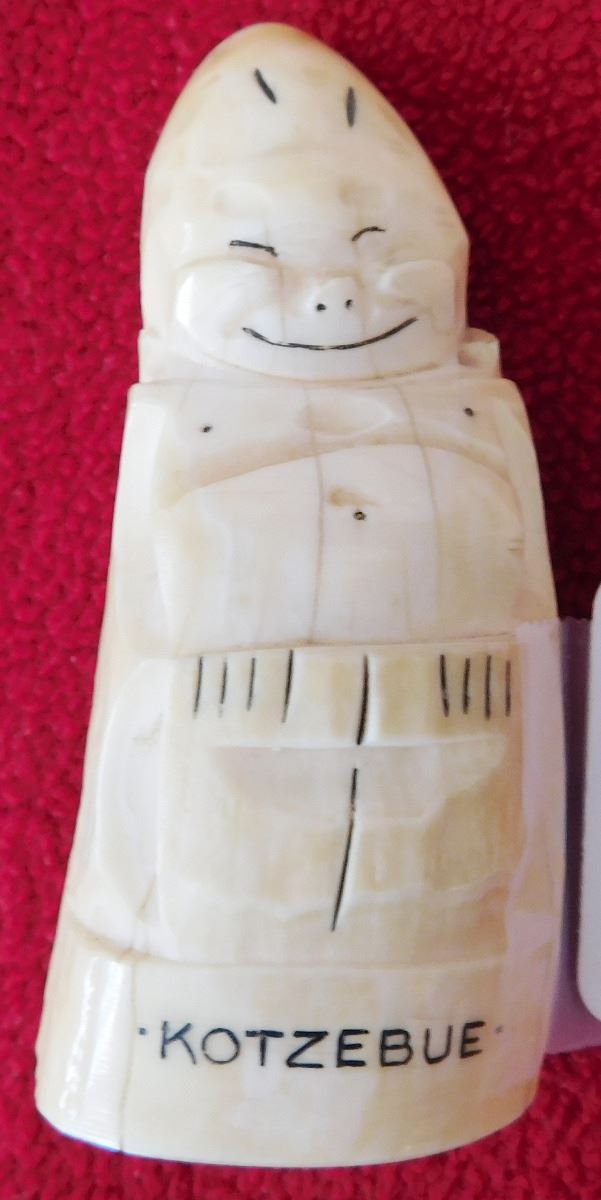 Eskimo Bone Figure, circa 1900s. Made of bone and measuring 3.5" x 1.5". Kotzebue, Alaska. Smiling figure. Condition: 1 small crack, see images. Shipping: $17.50, w/insurance.
