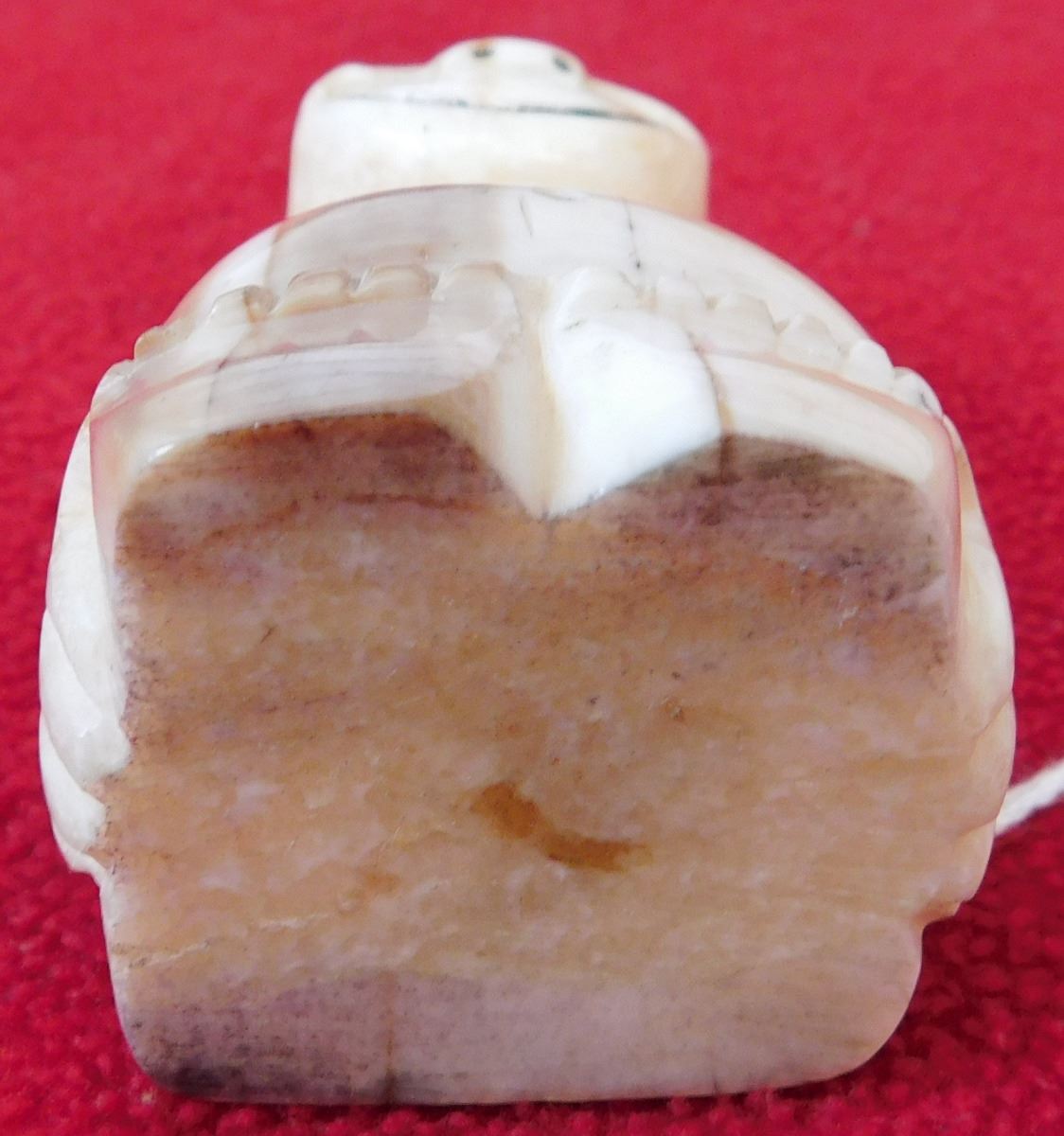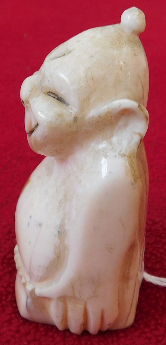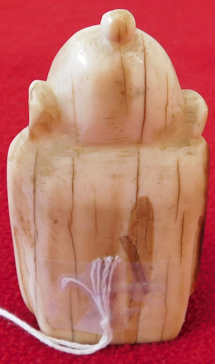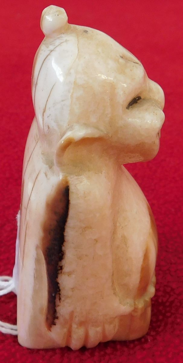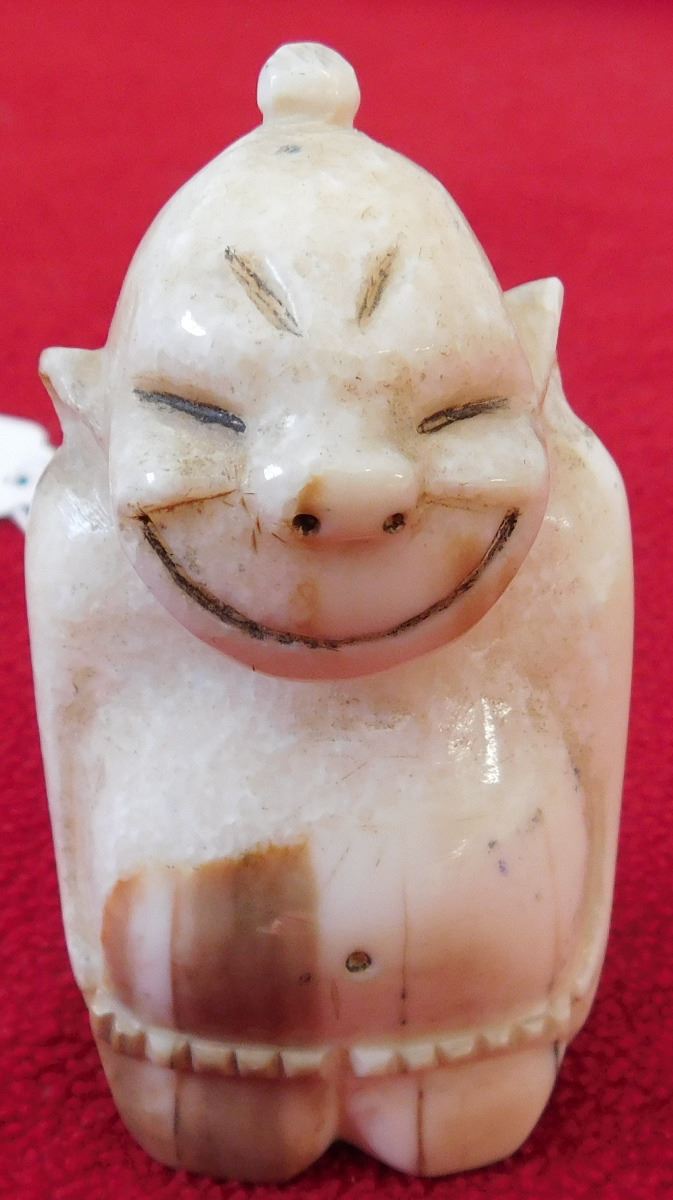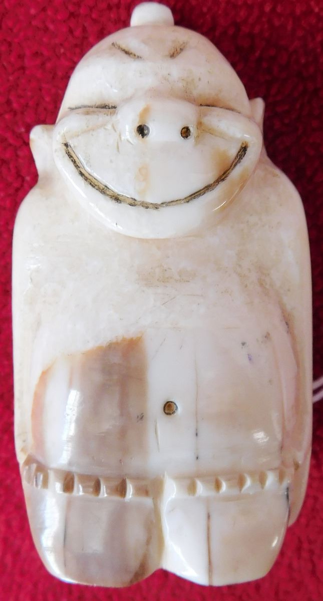 Eskimo Bone Figure, circa 1900s. Made of petrified bone, this item measures 3" x 1.5". From coastal Alaska. Smiling figure. Condition: Good, see images. Shipping: $18.00 w/insurance.