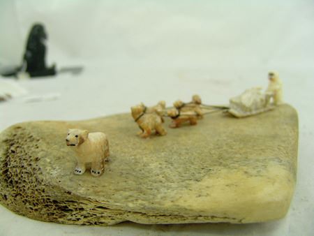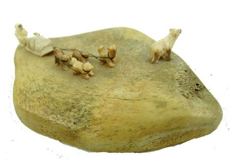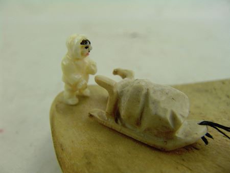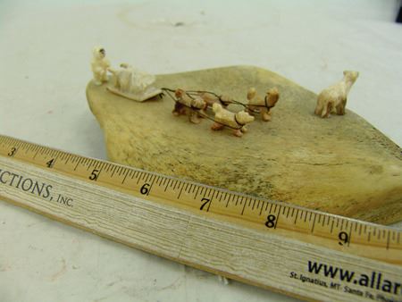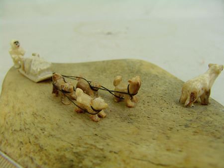 Mid 1900s, Fine hand carved miniature scene depicting a hunter with his dogsled with a polar bear on a whale bone ice flow. Very good condition, minor repairs. 7-1/2" x 5-1/2"