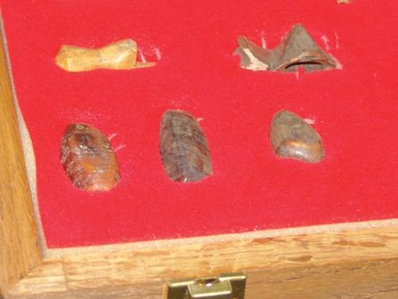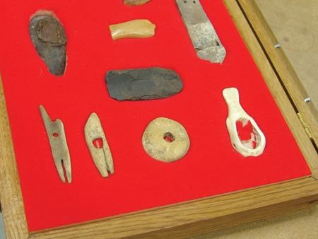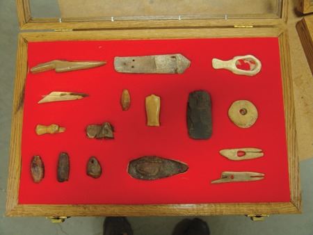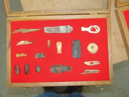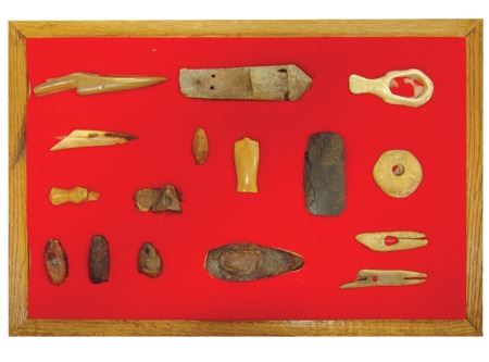 Pre Historic, Display of 16 excavated bone, stone, and ivory relics including harpoon tips, diggers, scrapers, etc. In a professional display case. Various conditions. Largest 5" (12" x 8" case)