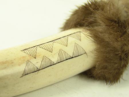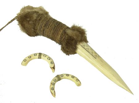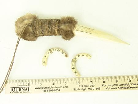 Circa Early/Mid 1900s, Hand carved bone blade with scrimshaw designs and beaver with a jute handle plus two colored tusks with circular designs. Very good condition. 9" x 2-1/2" From the Johnson Collection.