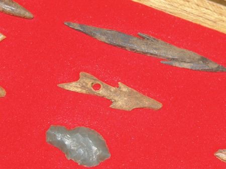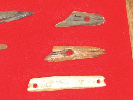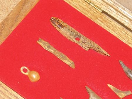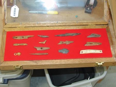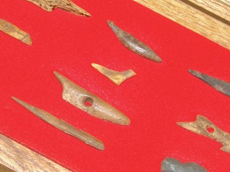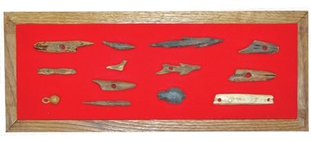Prehistoric, Wonderful display of old hand carved bone relics, mostly harpoon tips and small tools. In professional display. Various conditions. Largest 4-1/2" (12" x 8" case)